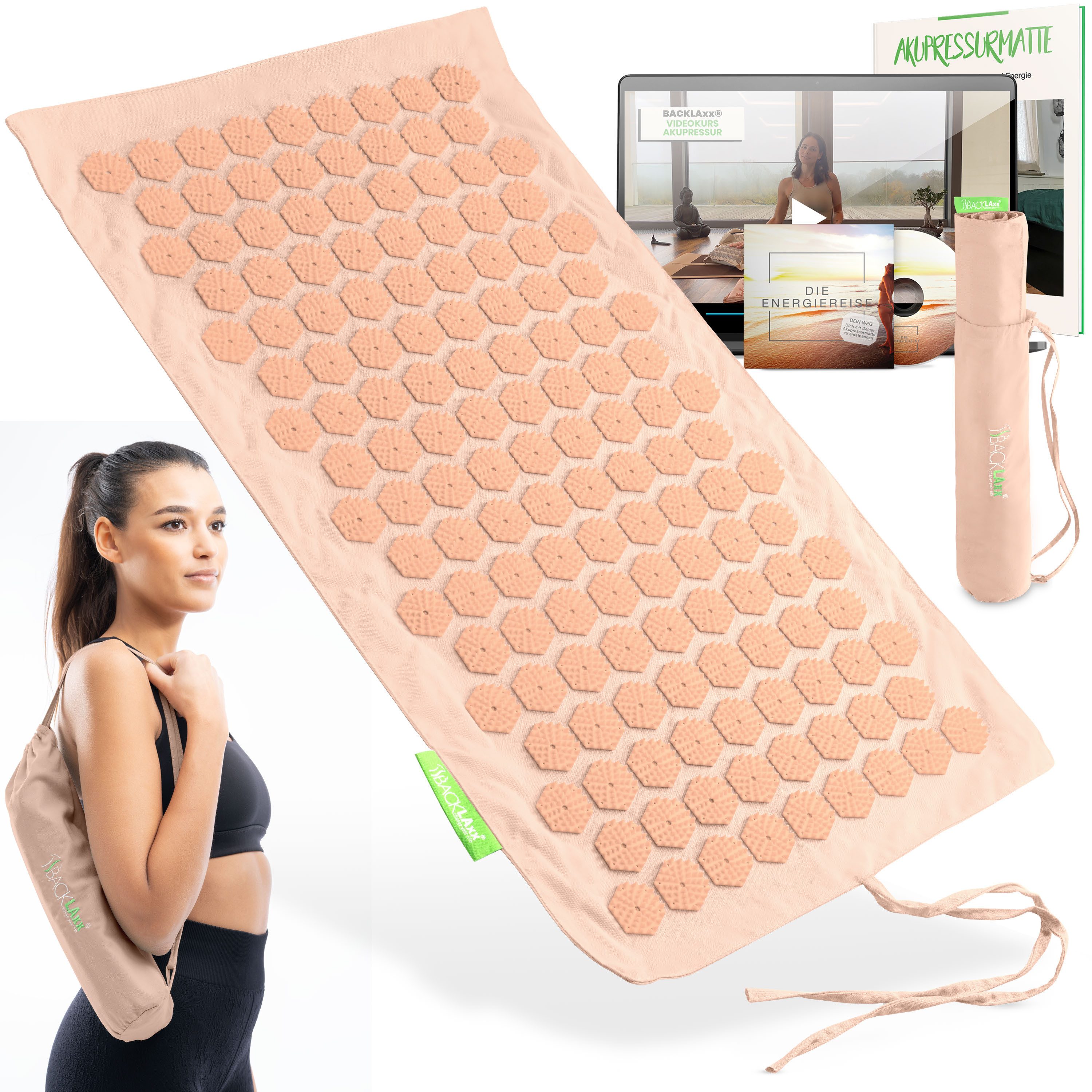 Lieferumfang | 1x Matte, 1x Tasche, gratis Download: 2x Hörbücher mit knapp 110 Minuten Entspannung und 1x eBook zum Thema Akupressur |