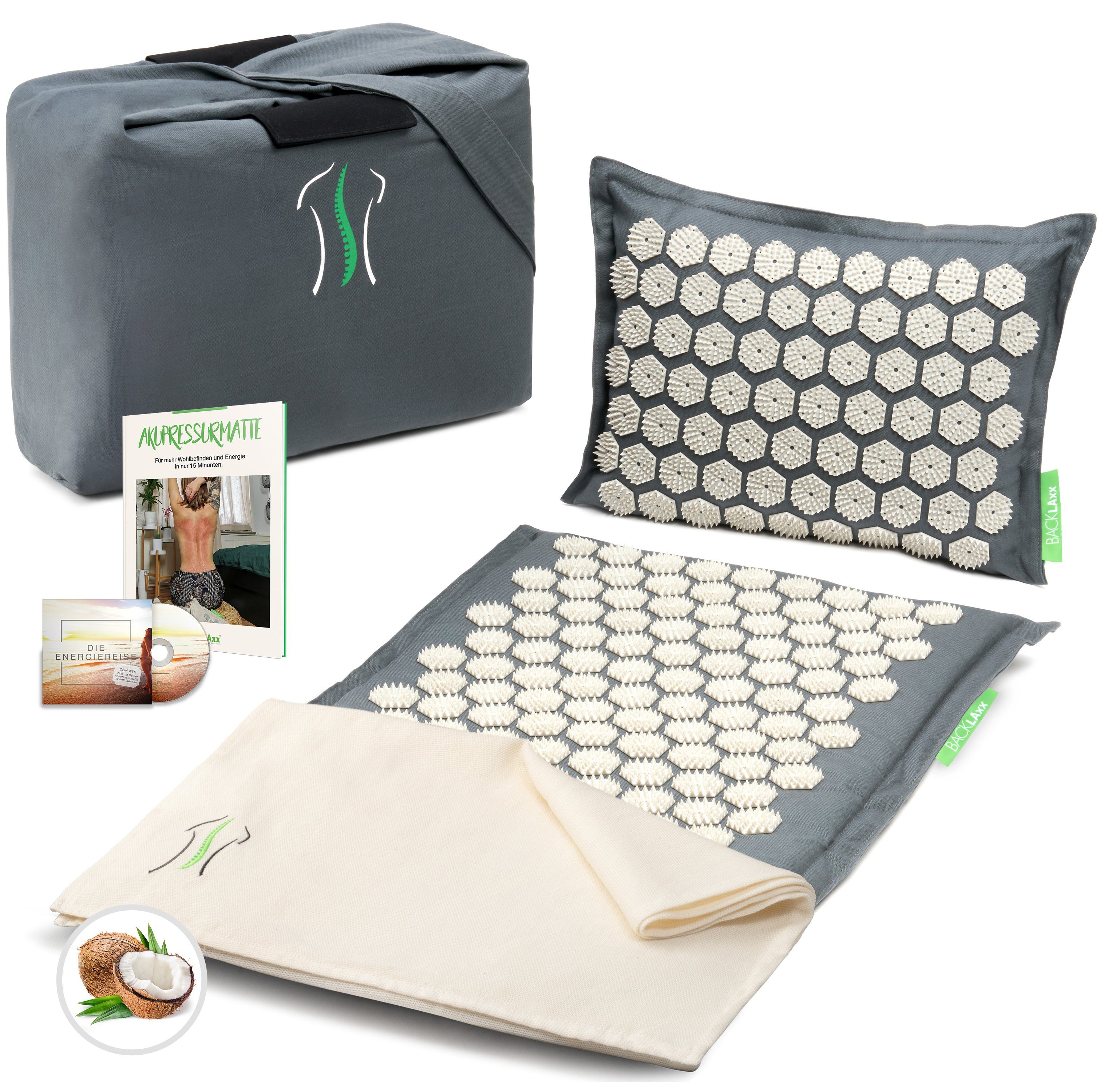 Lieferumfang | 1x Matte, 1x Kissen, 1x Tasche, 1x Tuch, gratis Download: 2x Hörbücher mit knapp 110 Minuten Entspannung und 1x eBook zum Thema Akupressur |
