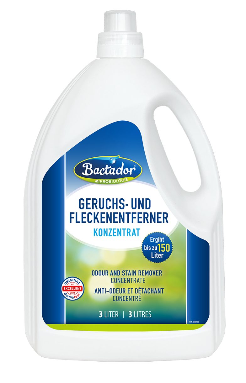 Die originale, hochwirksame Bactador-Technologie mit probiotischen Mikroorganismen beseitigt die Geruchsursache und neutralisiert Gerüche und Flecken porentief und dauerhaft. Die Bactador Mikrobiologie bietet eine material- und hautschonende Alternative für aggressive, chemische Reinigungsmittel und ist geeignet für die Umgebung von Mensch und Tier.