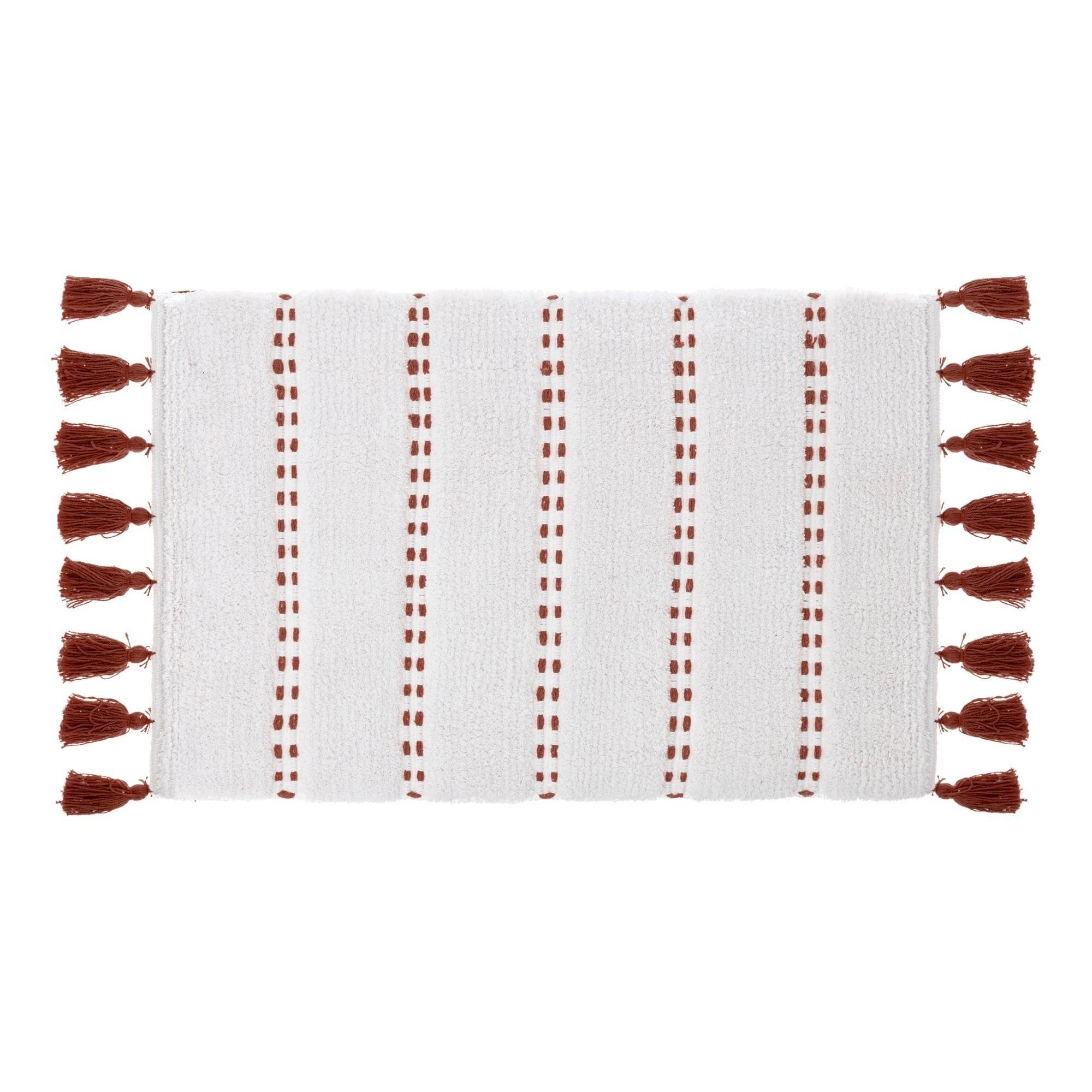 Badteppich mit Fransen hat eine klassische Form, die universellste. Der Teppich hat Abmessungen von 50 x 75 cm. Dadurch passt es in die meisten Badezimmer, auch in die kleinen, und gleichzeitig reicht es aus, frei darauf stehen zu können und sich im Badezimmer bewegen zu können. Das Produkt besteht aus Baumwolle, strapazierfähigem Material, resistent gegen Wischen oder Verblassen.