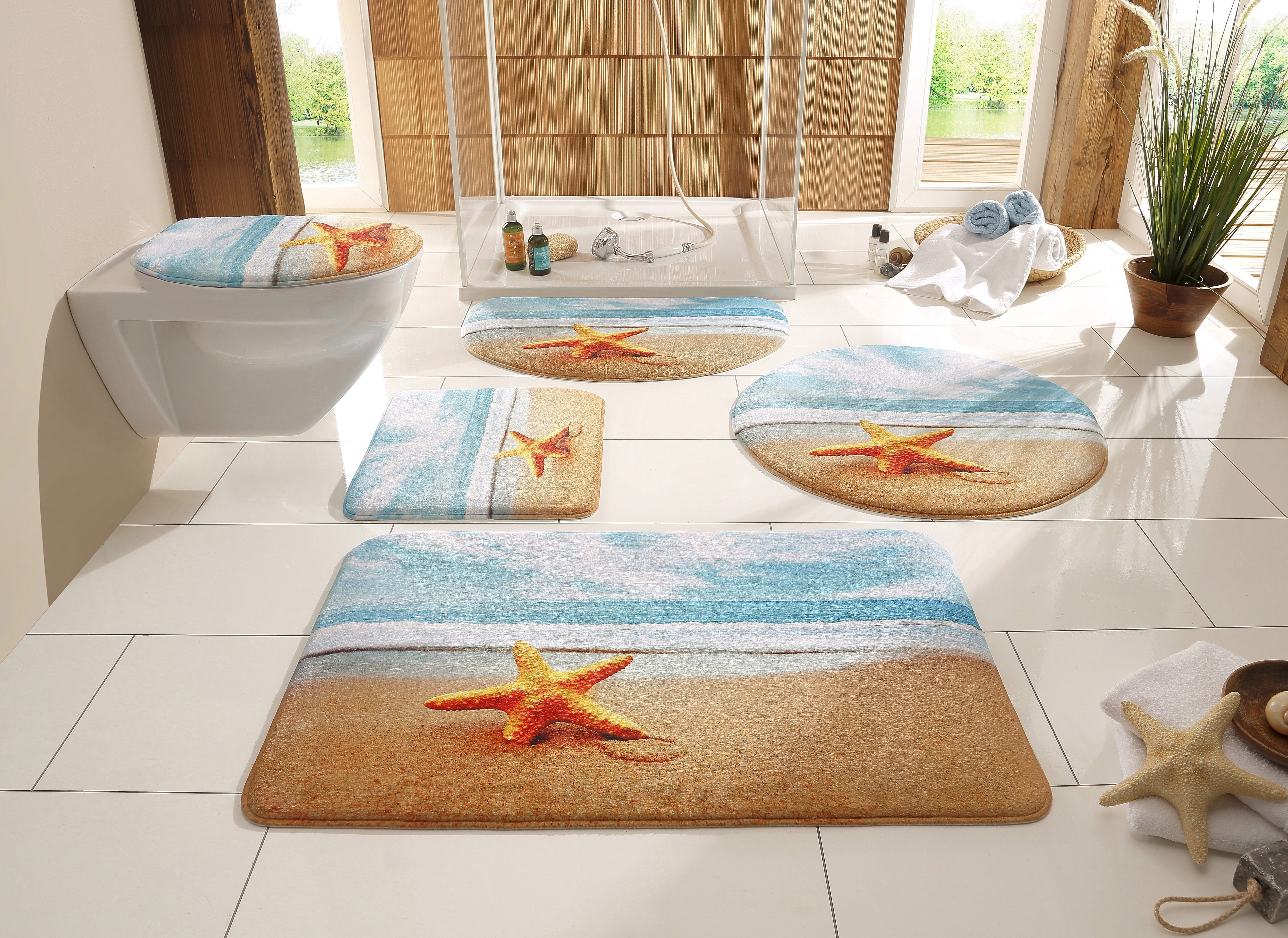 Markeninformationen | Farbenfrohes Design im detailreichen Fotodruck bietet der Badteppich »Seestern« mit Memory-Schaum von my home selection. Er gibt dem Badezimmer ein frisches Ambiente und kann mit seiner Form vielseitig genutzt werden. Ganz nach Wunsch und räumlichen Gegebenheiten kann er seinen Platz mitten im Raum oder als Badvorleger vor der Wanne, Dusche oder dem Waschbecken erhalten. Die Badematte zeichnet sich durch kuschelweichen Flor aus. Sie schmeichelt der Haut beim täglichen Körperpflegeprogramm und vermittelt die gewünschte Wärme. Durchdacht sind die qualitativen Details und praktischen Eigenschaften. Die Badezimmermatte ist mit einer rutschhemmenden Rückenbeschichtung ausgestattet und kann auf fußbodenbeheizten Böden zum Einsatz kommen. Gemäß STANDARD 100 by OEKO-TEX®. Die Reinigung erfolgt bei bis zu 40°C in der Waschmaschine und mit anschließendem Gang in den Trockner. Schnell trocknend steht der my home selection Badteppich »Seestern« mit Memory-Schaum im Nu wieder zur Verfügung |