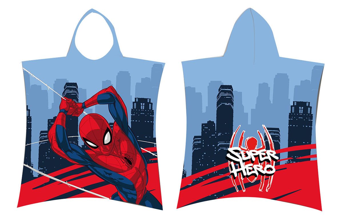Spider-Man ist mit die erfolgreichste und wichtigste Marvel-Figur, welche die Kinowelt erobert hat und eine riesige Fangemeinde besitzt. Nachts setzt er seine Superkräfte ein um gegen böse Mächten zu Kämpfen und tagsüber hat er mit den Problemen und Mühen des Alltags zu kämpfen. Seine größten Feinden und Widersacher sind Green Goblin, Dr. Octopus, Venom, Sandman, Lizard, Electro, Rhino, Black Cat und Carnage. Mit diesem Badeponcho haben Kinder nun die Möglichkeit ihrem Leinwandhelden ganz nahe zu sein. Ob am Strand oder im heimischen Badezimmer, mit dem flauschigen Kapuzenbadetuch ist man Ruch zuck trocken weil es sehr weich, bequem und saugfähig ist. Das Poncho-Badetuch eignet sich auch als Kinderbademantel nach dem Schwimmen im Schwimmbad oder am Strand, da es auch eine Kapuze besitzt. Die Kapuze hilft dabei, dass die Haare schneller trocken werden und dadurch kann das Baumwoll-Handtuch auch bequem getragen werden. So erkennt man sein Kind auch beim rumtoben am vollen Ufer des Badesees sofort. Auf dem Badeponcho erkennt man die berühmte Spinne, die gerade sich an ihrem Spinnennetz entlang hangelt und auf der Rückseite erkennt man die Aufschrift "Super Hero" mit seinem Spinnen-Logo. Ein cooles Motiv, dass für gute Laune sorgt!