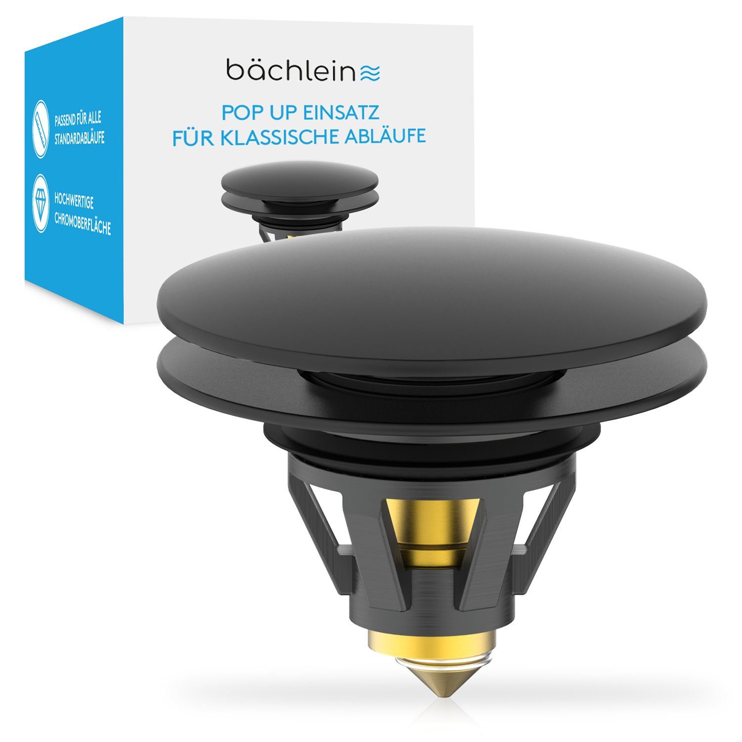Der Bächlein Pop-Up Waschbeckenstöpsel ist die ideale Lösung für jeden Waschtisch. Dank seiner genormten Maße passt er perfekt in alle Abläufe mit einem Durchmesser von 40 mm. Die Installation ist kinderleicht: Einfach den alten Stöpsel entfernen und den neuen Pop-Up Stöpsel einsetzen. Die integrierte Pop-Up Funktion ermöglicht ein schnelles und einfaches Öffnen und Спрятать des Abflussstopfens, wodurch die Bedienung zum Kinderspiel wird.