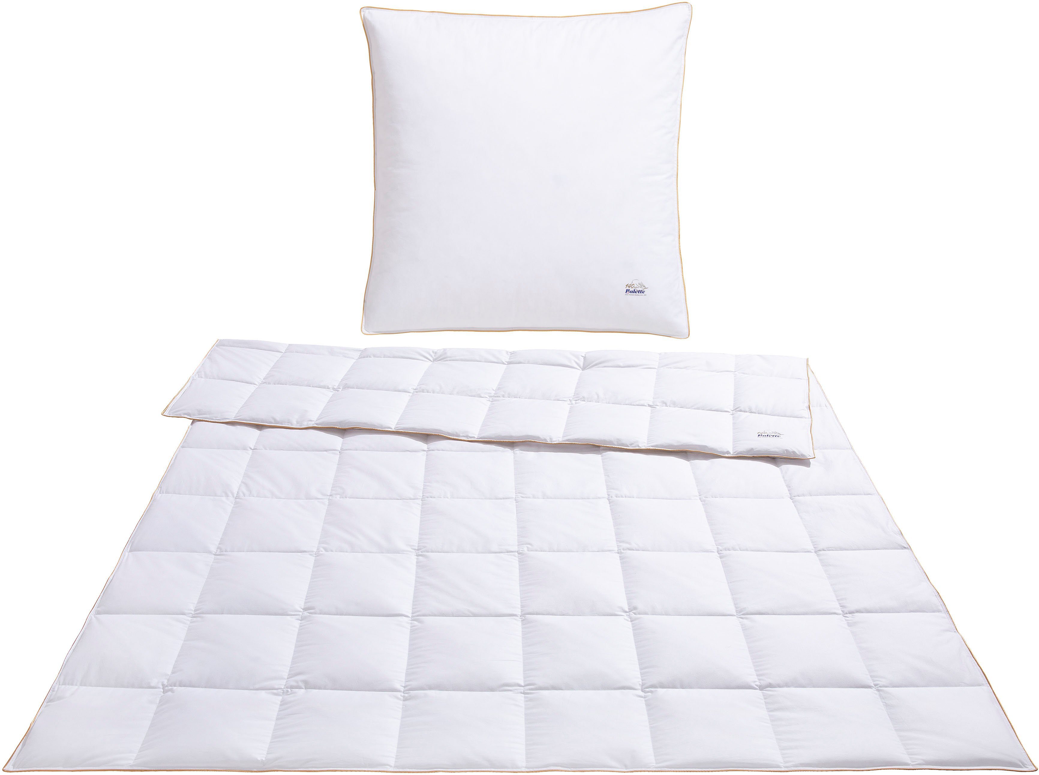 Materialzusammensetzung | Bettdecken Bezug: 100% Baumwolle. Kopfkissen Bezug: 100% Baumwolle. Bettdecken Füllung: 100% Daunen. Kopfkissen Füllung: 85% Federn, 15% Daunen |