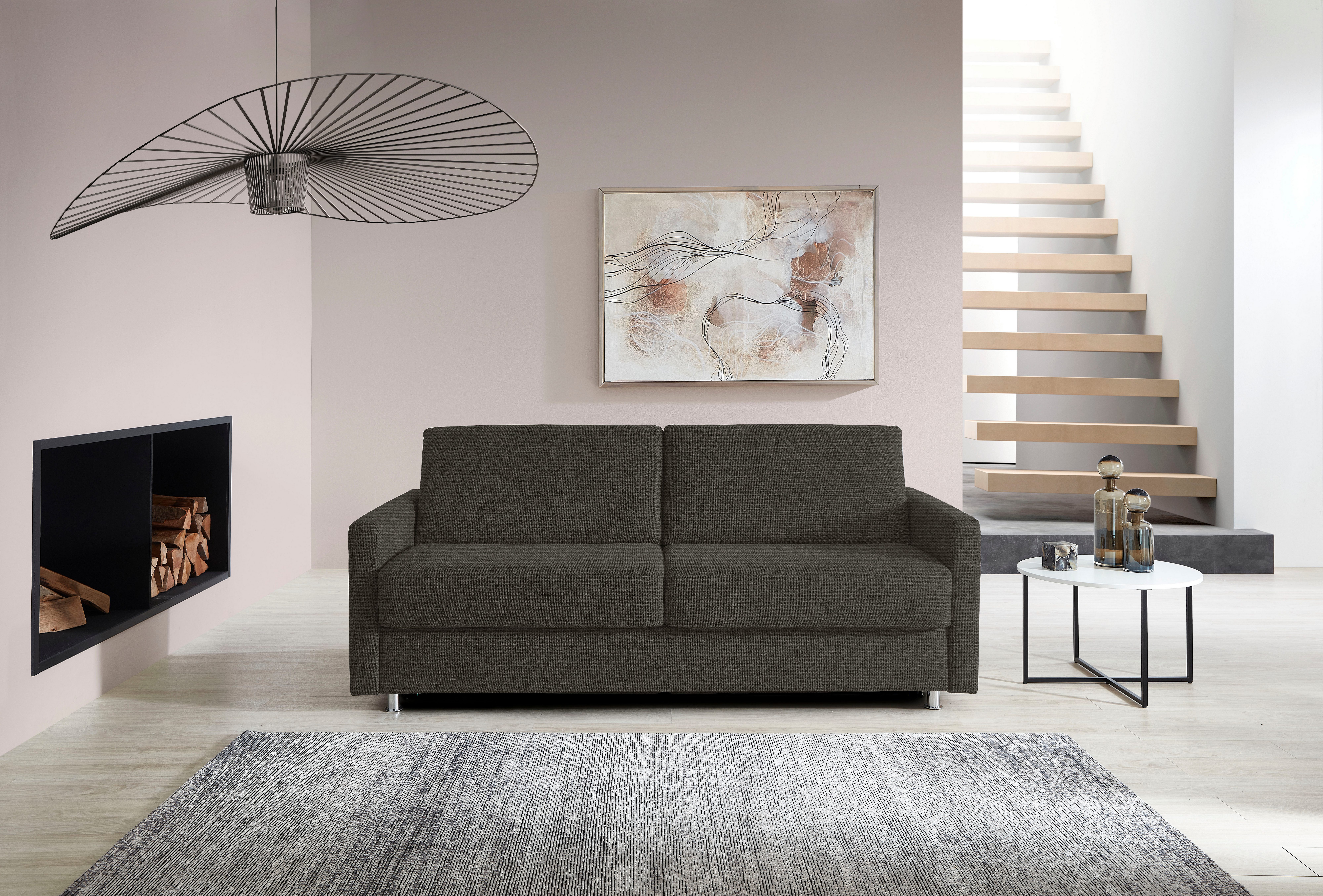 Hohen Sitzkomfort und eine gute Luftzirkulation bietet dir dieses Schlafsofa »JUNARA, Dauerschläfer mit zweigeteiltem Lattenrost« von Bali dank der Kaltschaumpolsterung. Zudem verfügt das Möbelstück über eine ausziehbare Liegefläche, sodass es sowohl als gemütliche Sitzgelegenheit für den Tag als auch als Gästebett genutzt werden kann. Die Couch ist manuell verstellbar und lässt sich so mit wenigen Handgriffen in die gewünschte Position bringen. Die Füße aus Chrom benötigen nahezu keine Pflege, denn Rückstände, Schmutz oder Staub lassen sich ohne großen Aufwand mit einem feuchten Tuch abwischen.