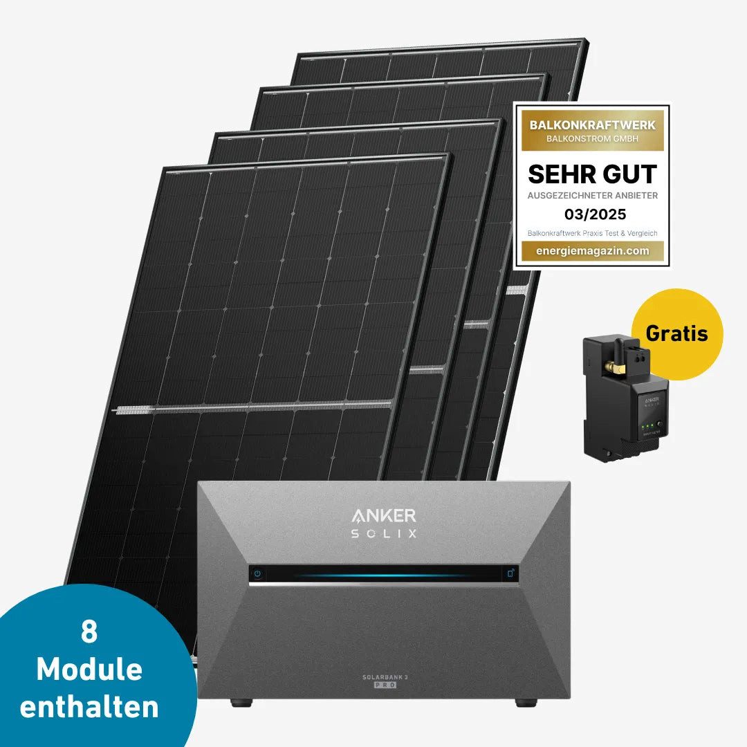 Balkonkraftwerk mit acht bifazialen Solarmodulen (3600 W) und Anker SOLIX Solarbank 3 E2700 Pro Stromspeicher. 2,7 kWh Speicherkapazität, integrierter Wechselrichter und 3600 W Eingangsleistung. Gratis dazu: Anker Smart Meter für intelligente Energiesteuerung per App.