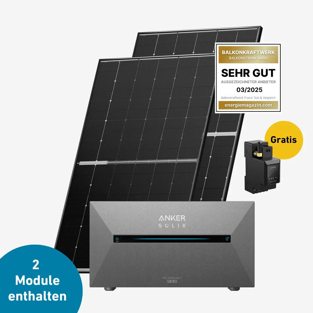 Lieferumfang | 2 x 450-Wp JA Solarmodule 1 x Anker SOLIX Solarbank 2 E1600 Pro 1 x AC-Anschlusskabel (5 m) 8 x MC-4 Verlängerungskabel (3 m) 1 x Anker Smart Meter 1 x Stromwandler 1 x Verlängerungsantenne |