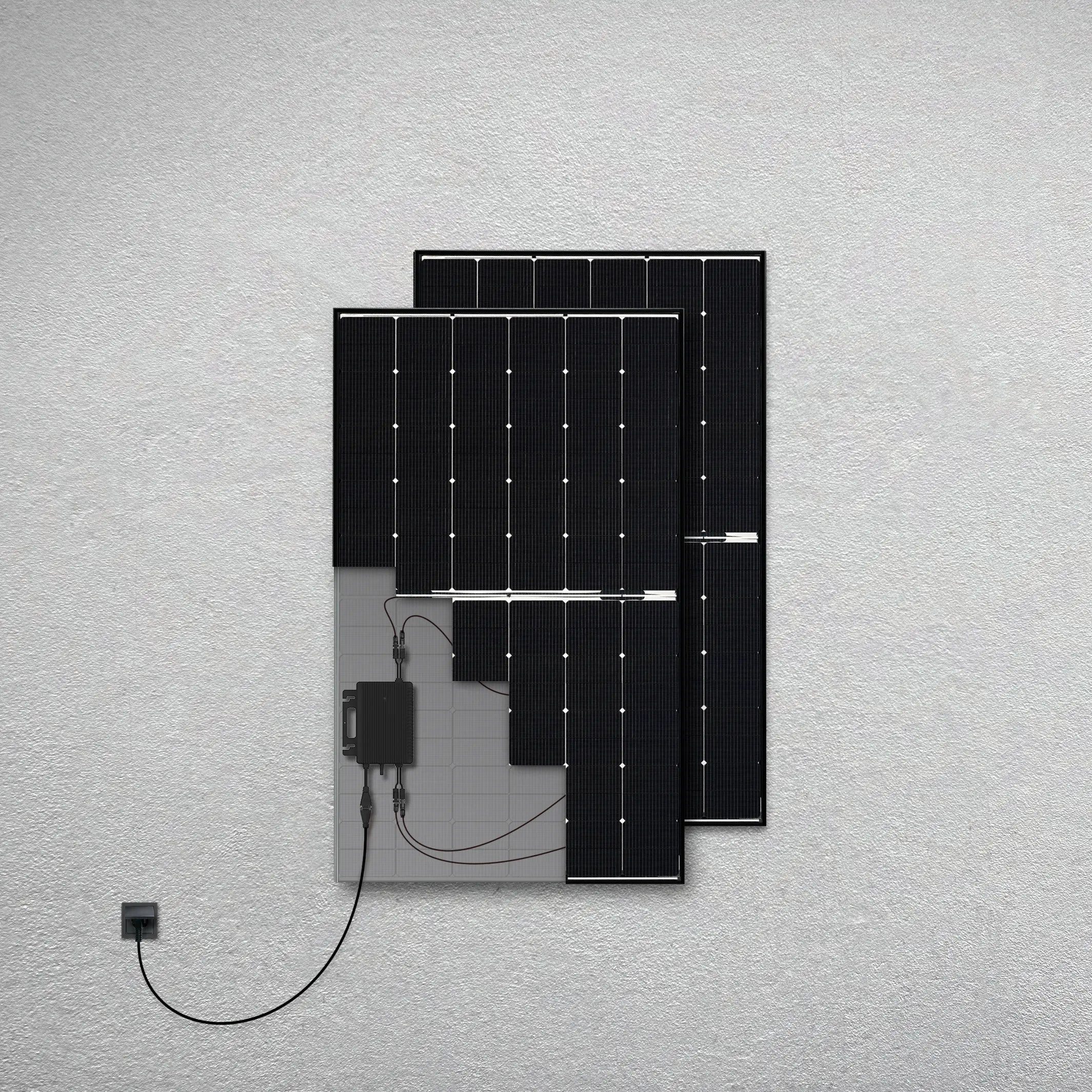Balkonkraftwerk mit zwei bifazialen Solarmodulen (900 W) und Hoymiles 800-Watt-Wechselrichter mit integriertem WLAN für maximale Effizienz.