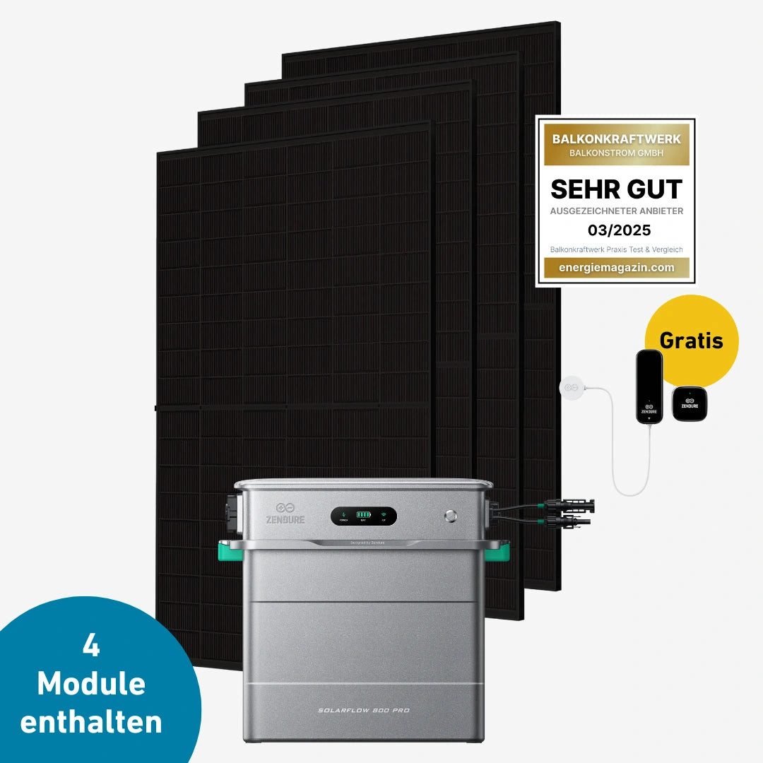 Lieferumfang | 4 x 500-Wp Sunpro Solarmodule 1 x Solarflow 800 Pro 1 x AC-Netzkabel (3 m) 1 x Zendure Smart Meter |