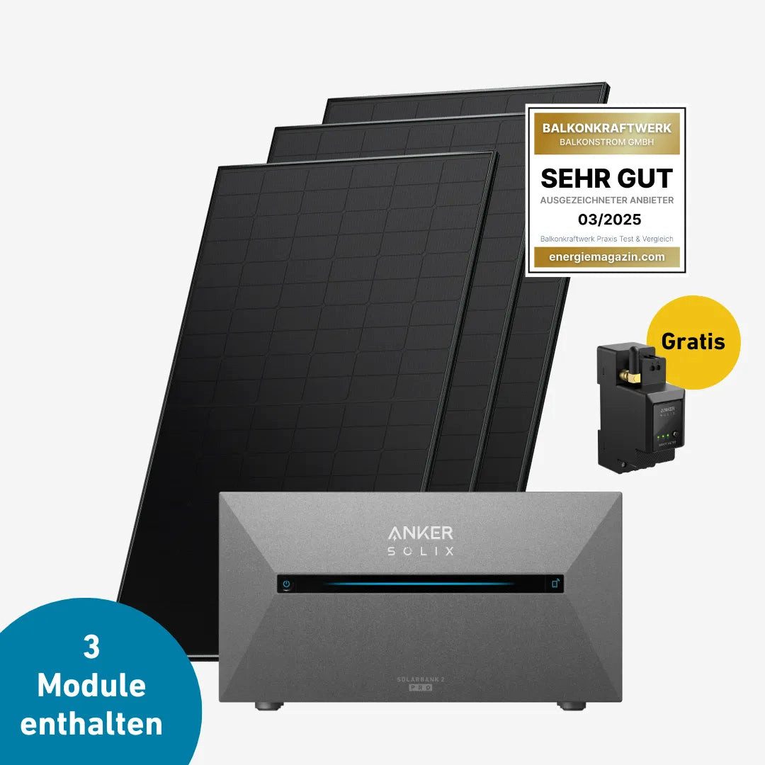Premium Balkonkraftwerk mit drei bifazialen Solarmodulen in Fullblack-Optik (1350 W) und Anker SOLIX Solarbank 2 E1600 Pro Stromspeicher. 1,6 kWh Speicherkapazität, integrierter Wechselrichter und 2400 W Eingangsleistung. Gratis dazu: Anker Smart Meter für intelligente Energiesteuerung per App.