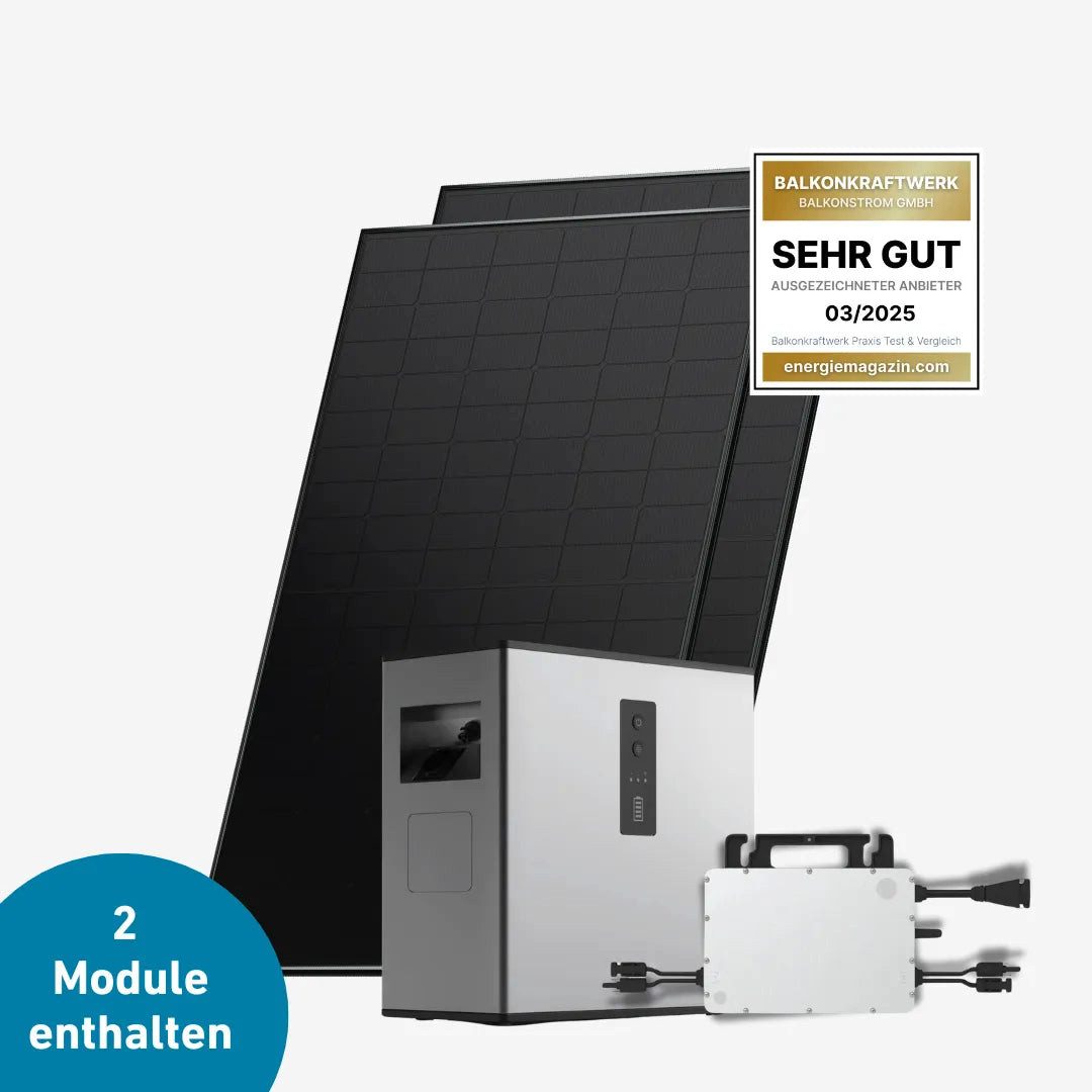 Lieferumfang | 2 x 450-Wp Bauer Solar Module 1 x Hoymiles HMS-800W-2T Wechselrichter 1 x Hoymiles MS A2 Speicher 2240Wh 1 x 1 5m MS Anschlusskabel 2 x 1 m & 2 x 0 5 m MC-4 Verlängerungskabel |