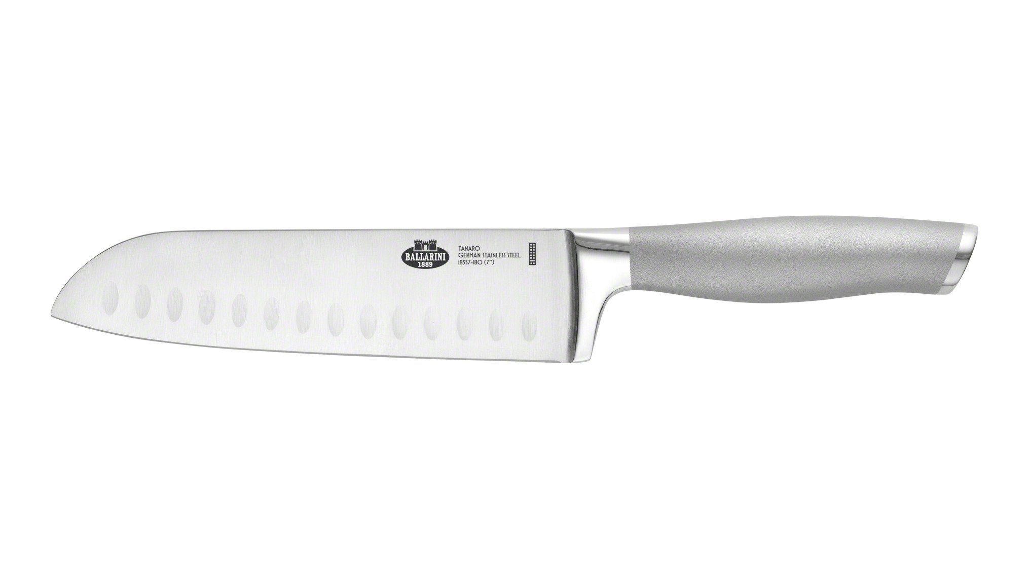 BALLARINI Tanaro Santokumesser 18 cm, Kullenschliff Ein neues Schneidgefühl. Klinge aus der Stahlsorte Deutsch. Edelstahl Für präzises Schneiden Korrosionsbeständig Hochwertig verarbeitet Beschreibung Wer Messer nicht nur zum Schneiden nutzt, sondern sie als Designobjekte schätzt, findet in diesem Schneidwerkzeug eine Symbiose aus hochwertiger Verarbeitung und kunstvoller Ästhetik, die höchsten Ansprüchen gerecht wird. Das Santoku ist die japanische Варианты des Kochmessers und insbesondere für drei Lebensmittelarten besonders gut eignet: Fisch, Fleisch und Gemüse. Das Messer hat ein ergonomisches Griffdesign aus Edelstahl und bietet so bei der Arbeit viel Komfort ohne Ermüden. Klinge gefertigt aus der Stahl der Sorte Deutsch. Edelstahl Длина der Klinge: 18 cm. Robuste und langlebige Klinge für einfachesSchneiden. Ergonomischer Griff aus Edelstahl: Für angenehmes Arbeiten mit dem Messer. Ausbalanciertes Griffdesign. Eigenschaften Farbe: Silber Material: Deutsch. Edelstahl Griffart: Steck-Erl Schleifart: Kullenschliff Herstellungsart: geschweißt Lieferumfang: 1 Klingenhärte: 54-56 HRC Grifffarbe: Silber Griffmaterial: Edelstahl Abmessungen Gewicht netto: 0,22 kg Produktlänge: 31,50 cm Produktbreite: 2,50 cm Produkthöhe: 4,60 cm Klingenlänge: 18,00 cm Grifflänge: 13,20 cm Handle width: 2,50 cm Klingenbreite: 0,20 cm Klingenstärke: 0,20 cm