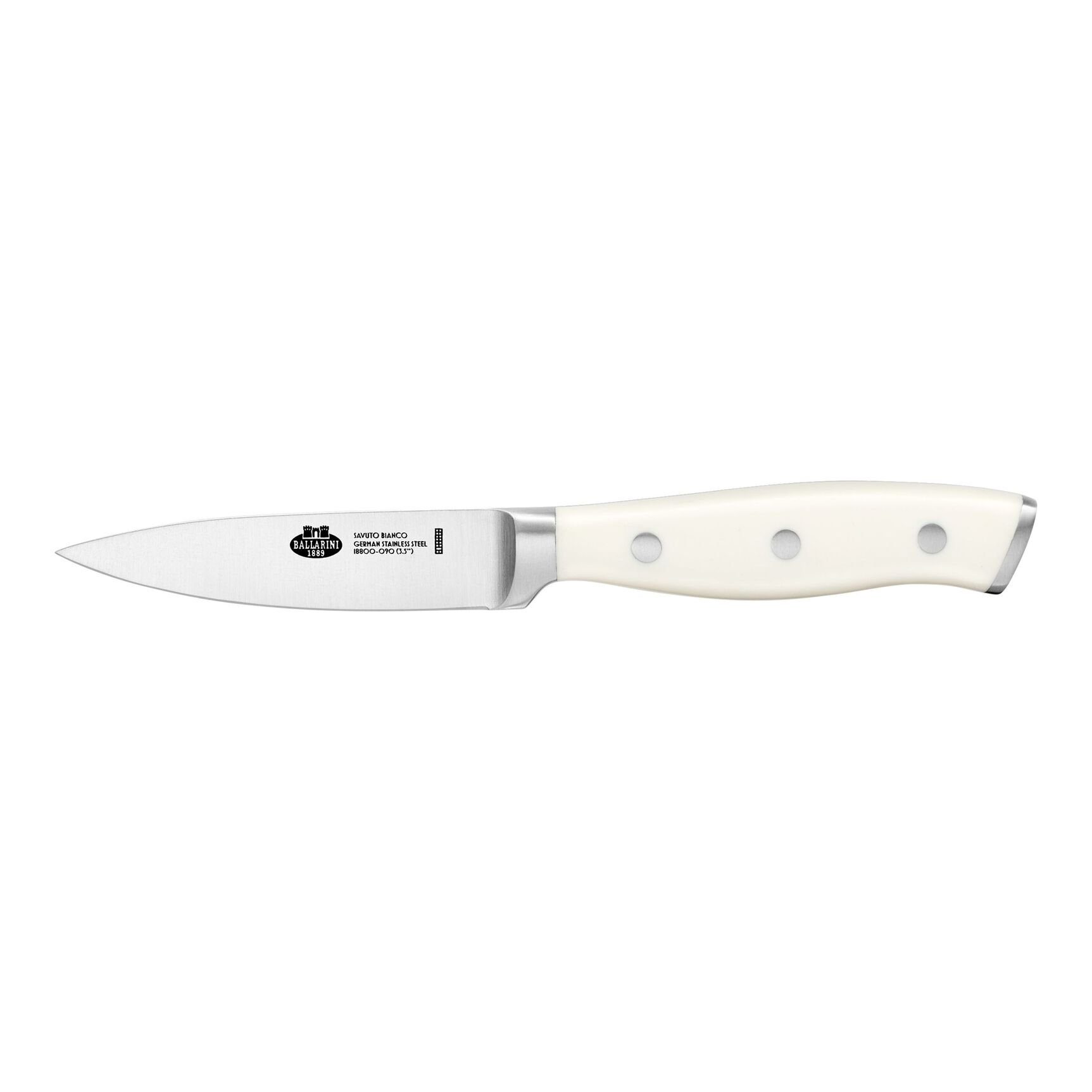 BALLARINI Savuto Spick & Garniermesser, 9 cm Elfenbein-Weiß Für Feinarbeiten ideal Klinge aus der Stahlsorte Deutsch. Edelstahl Für präzises Schneiden Hohe Korrosionsbeständigkeit Komfortables Schneiden Beschreibung Dieses Spick- und Garniermesser unterstützt dich in der Küche bei vielen verschiedenen Aufgaben, zum Beispiel wenn Obst oder Gemüse zu schälen sind oder wenn du diese Lebensmittel in kleine Stücke schneiden willst. Das Messer hat einen Griff aus Kunststoff und bietet so bei der Arbeit viel Komfort ohne Ermüden. Klinge hergestellt aus der Stahlsorte Deutsch. Edelstahl Klingenlänge: 9 cm. Robuste und haltbare Klinge für einfachesSchneiden. Ergonomischer Griff aus Kunststoff: Für angenehmes Arbeiten mit dem Messer. Ausbalanciertes Griffdesign. Eigenschaften Farbe: Weiß Material: Deutsch. Edelstahl Griffart: Flach-Erl Schleifart: Glattschliff Herstellungsart: geschweißt Klingenhärte: 54-56 HRC Grifffarbe: Schwarz Griffmaterial: Kunststoff Abmessungen Gewicht netto: 0,06 kg Produktlänge: 19,50 cm Produktbreite: 1,60 cm Produkthöhe: 2,40 cm Klingenlänge: 9,00 cm Grifflänge: 10,30 cm Handle width: 1,60 cm Klingenbreite: 0,20 cm