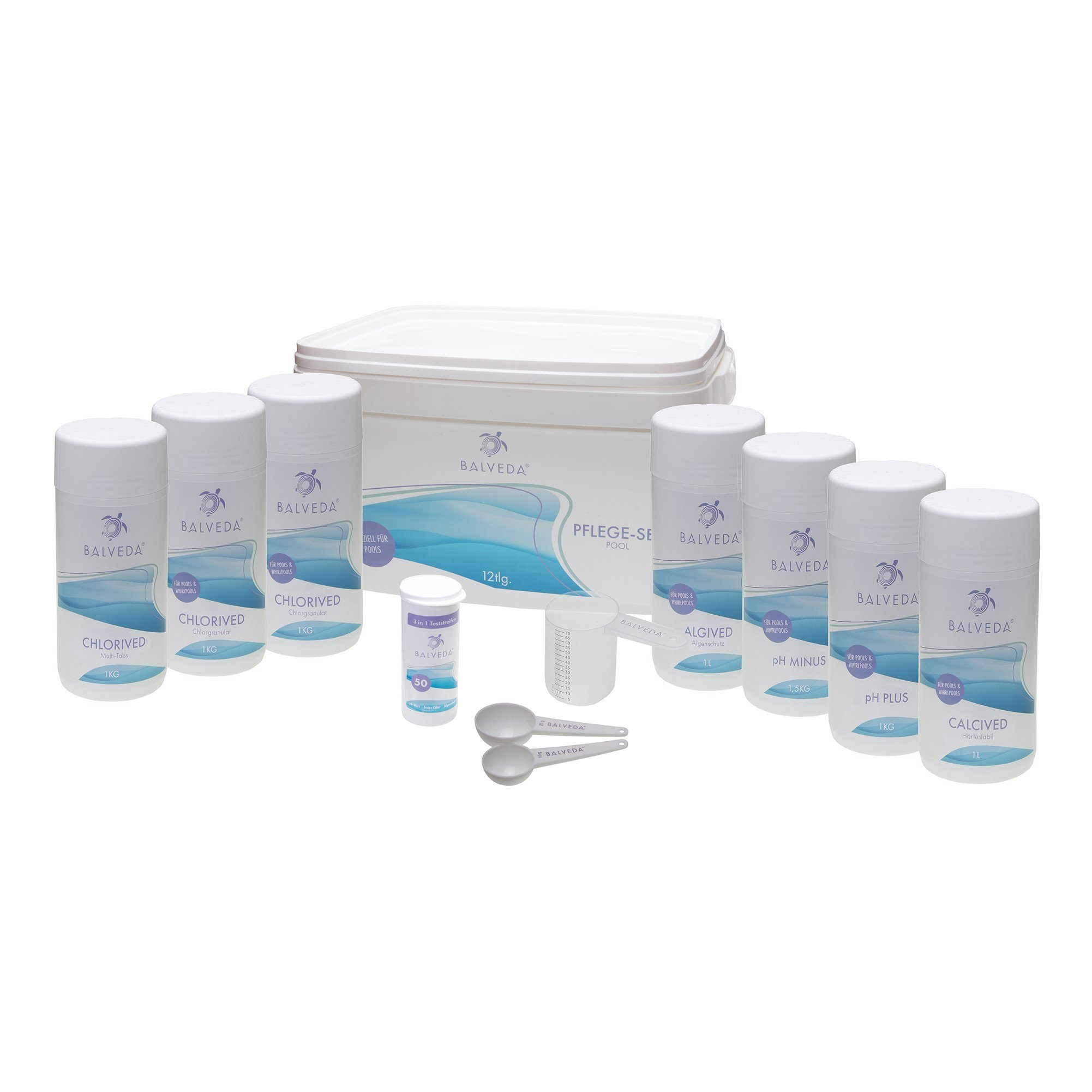 Das 12teilige BALVEDA® Wasserpflege-Set für den Pool beinhaltet die wichtigsten Wasserpflege-Produkte für den Start in die Saison. Verpackt in einer praktischen Box erhalten Sie ausgewählte BALVEDA® Produkte im Set zum Vorteilspreis. Das Gesamtpaket besteht aus 2x 1 kg Chlorgranulat, 1 kg Multi-Tabs, 1 kg pH Plus, 1 kg pH Minus, 1 l Algenschutz schaumfrei, 1 l Härtestabilisator und 50 Teststreifen zur Bestimmung von pH-Wert, Chlor und Algenschutzgehalt. Darüber hinaus enthält das Set 2 praktische Dosierlöffel und 1 Messbecher sowie hilfreiche Tipps für die Pool-Wasserpflege.