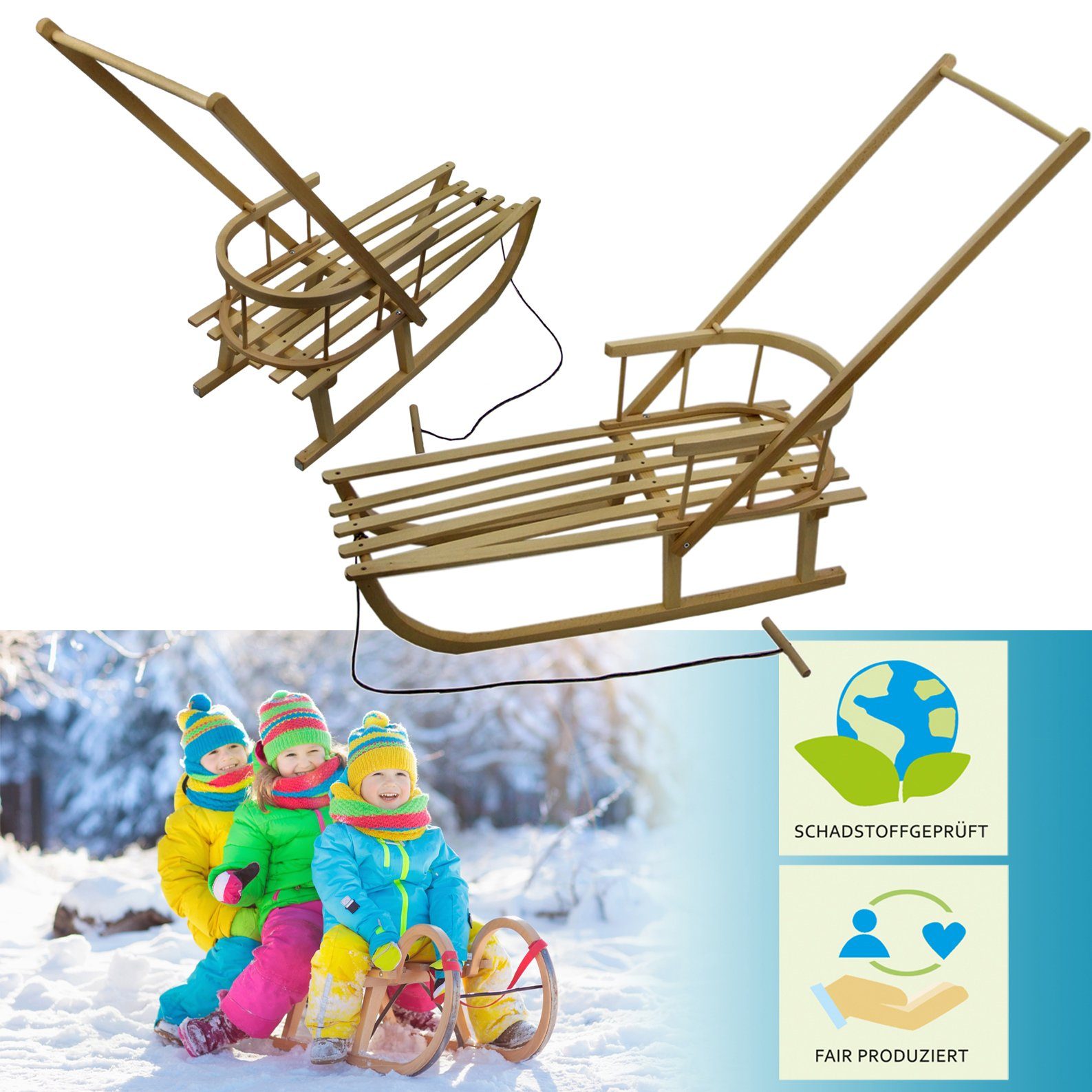 Lieferumfang | 1 x Holzschlitten 1x Rückenlehne 1 x Schiebestange 1 x Zugseil |