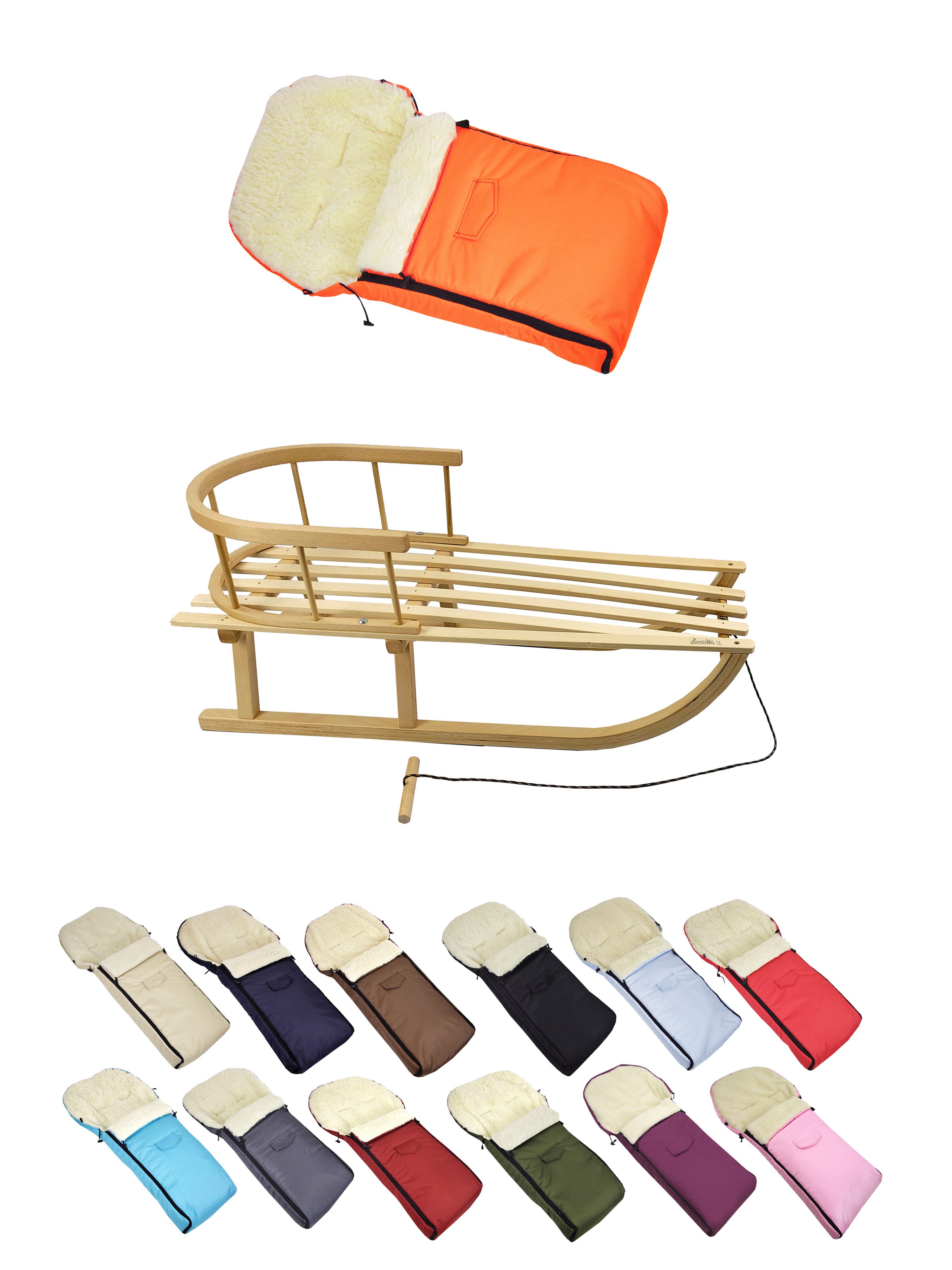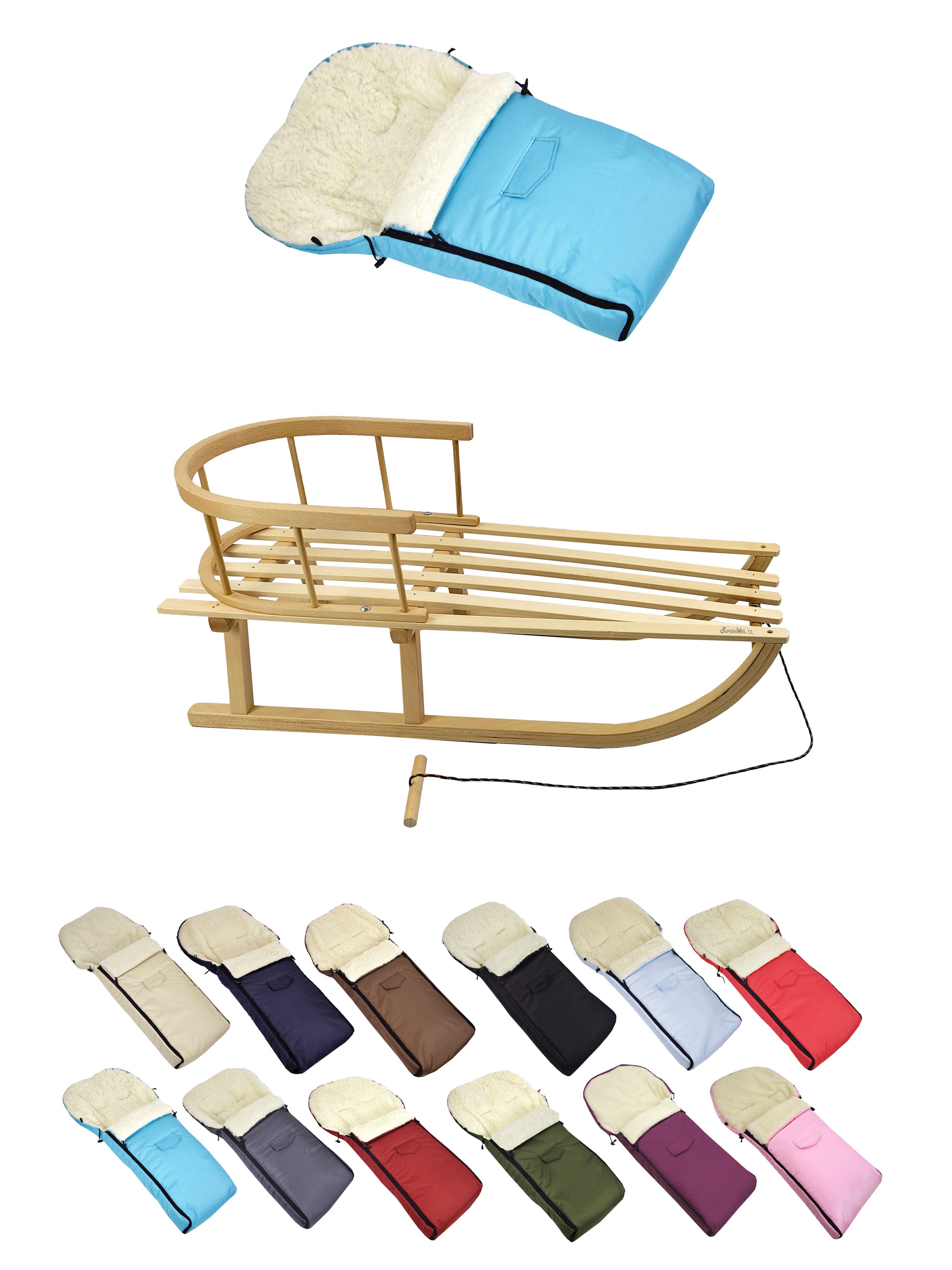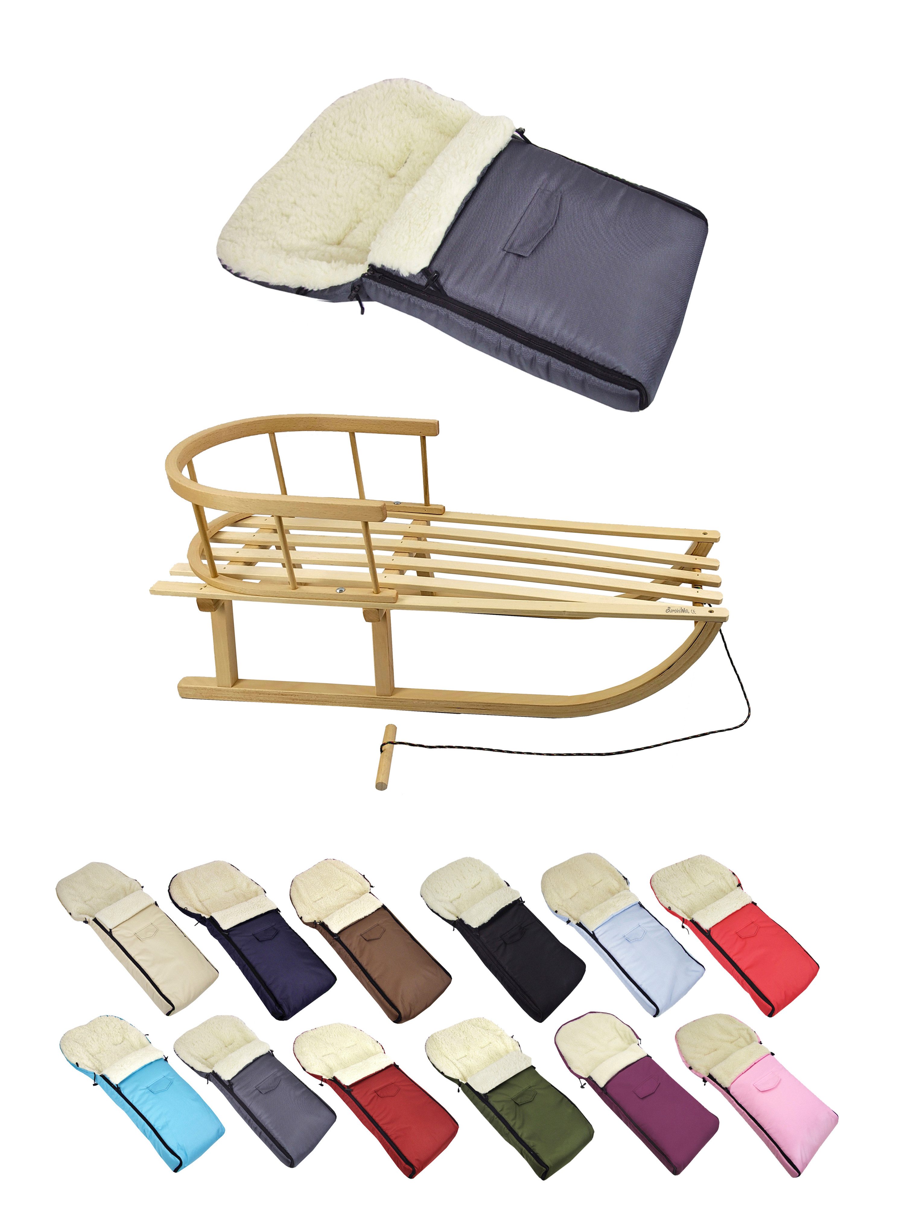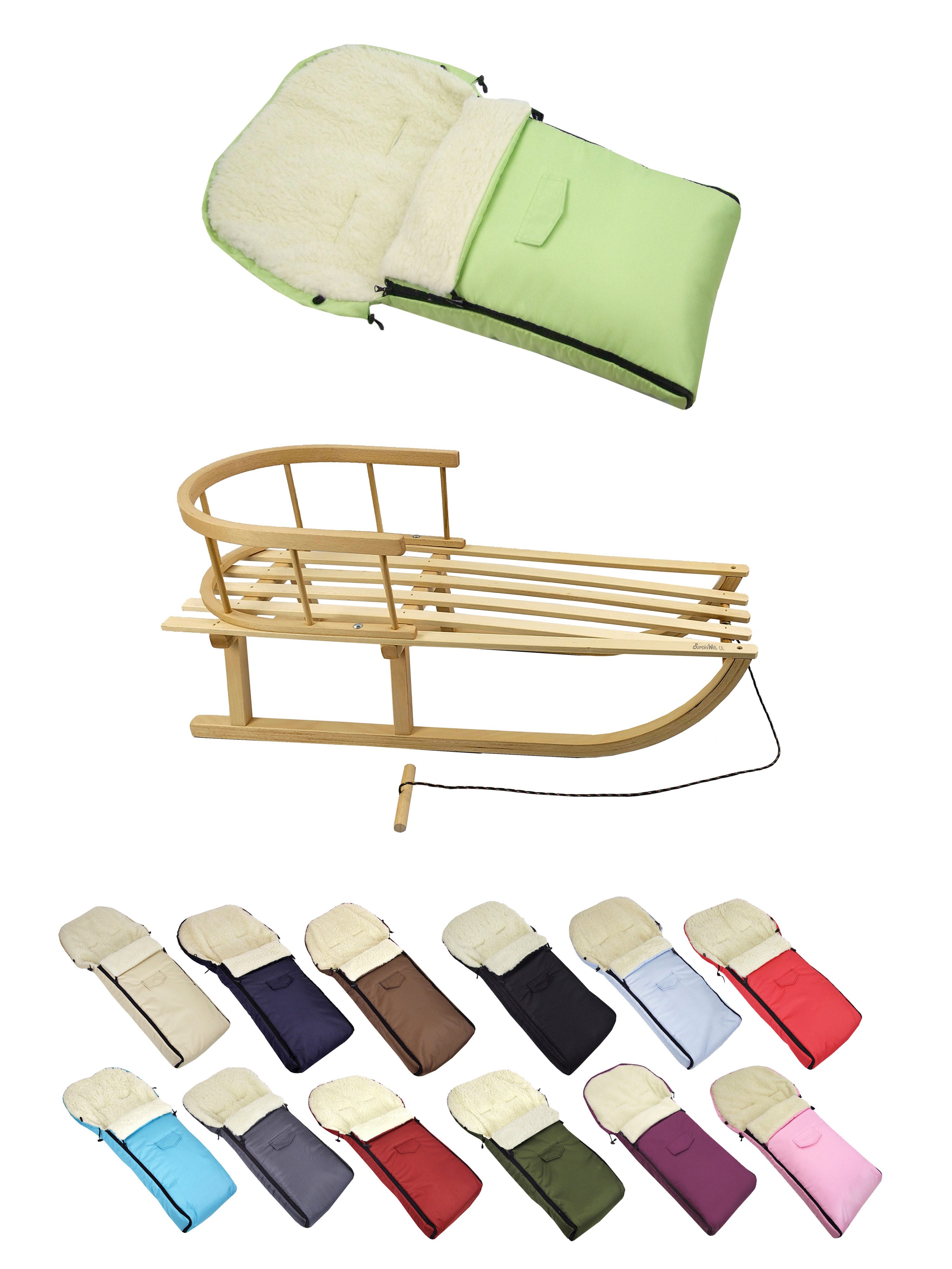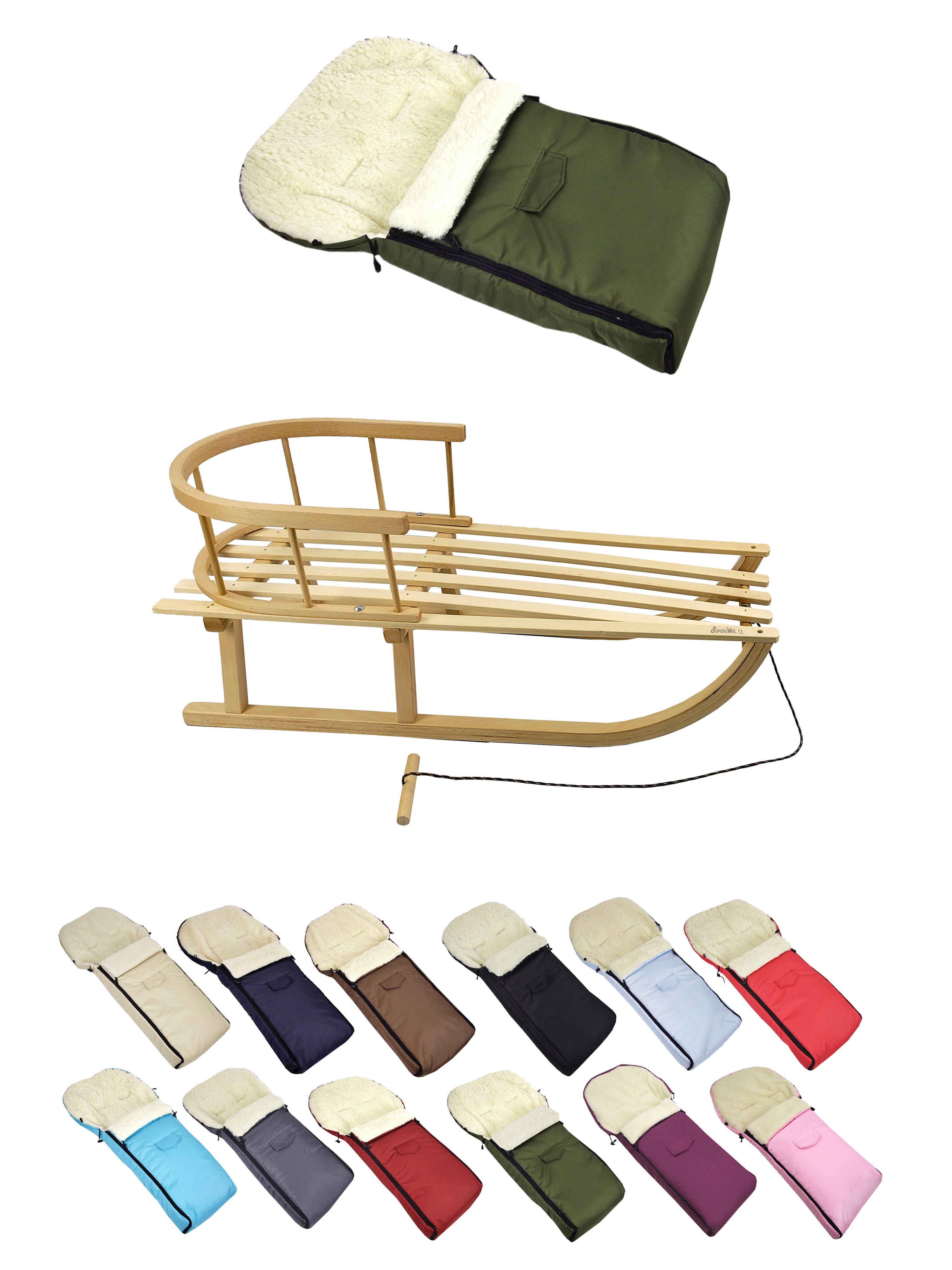 Details Material | aus Buchenholz, naturlackiert - Metallkufen, Bockstützen & Zugeisen pulverbeschichtet Winterfußsack: innen - mit Lammwolle, kuschelig und warm, aussen - hochwertiger Polyesterstoff, wind und wasserabweisend |