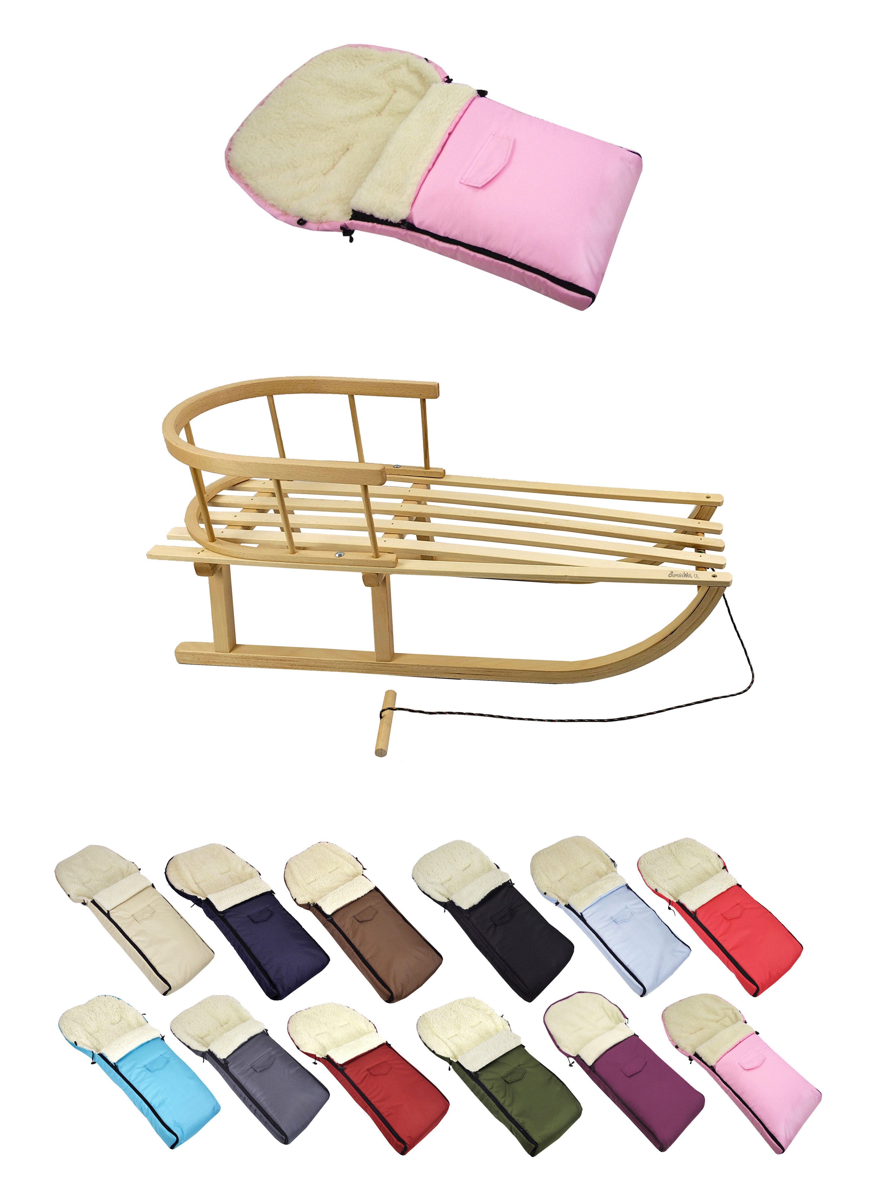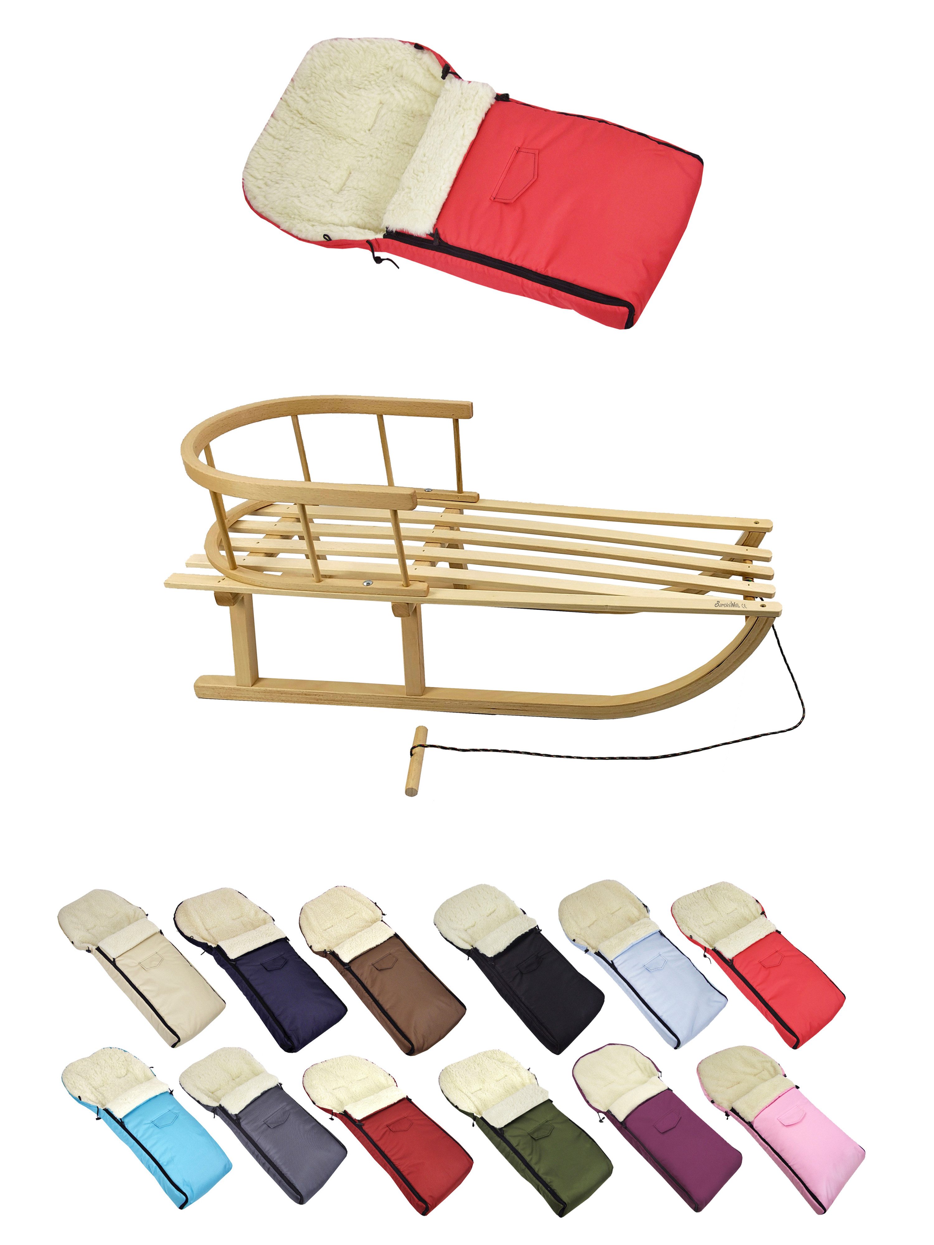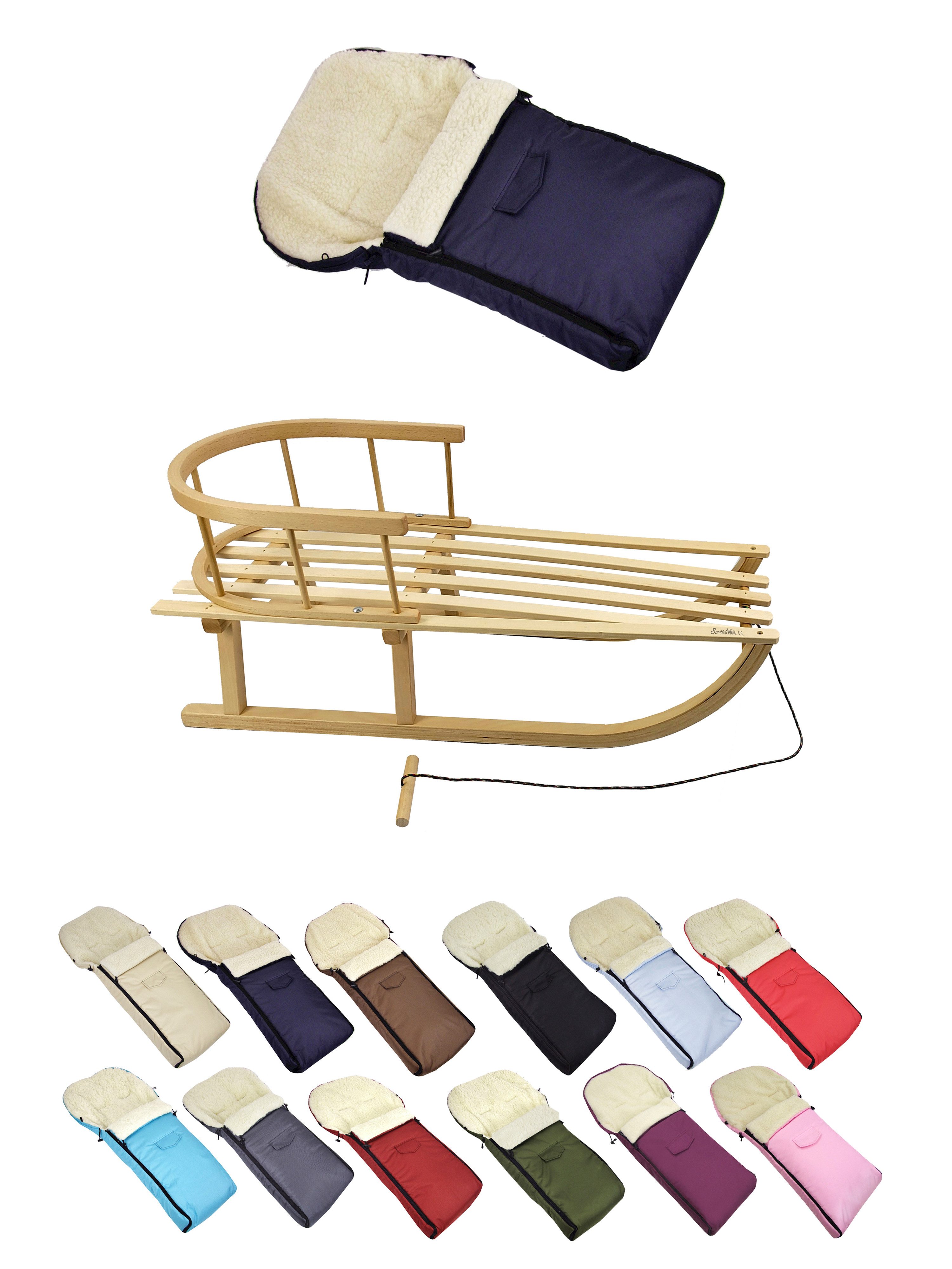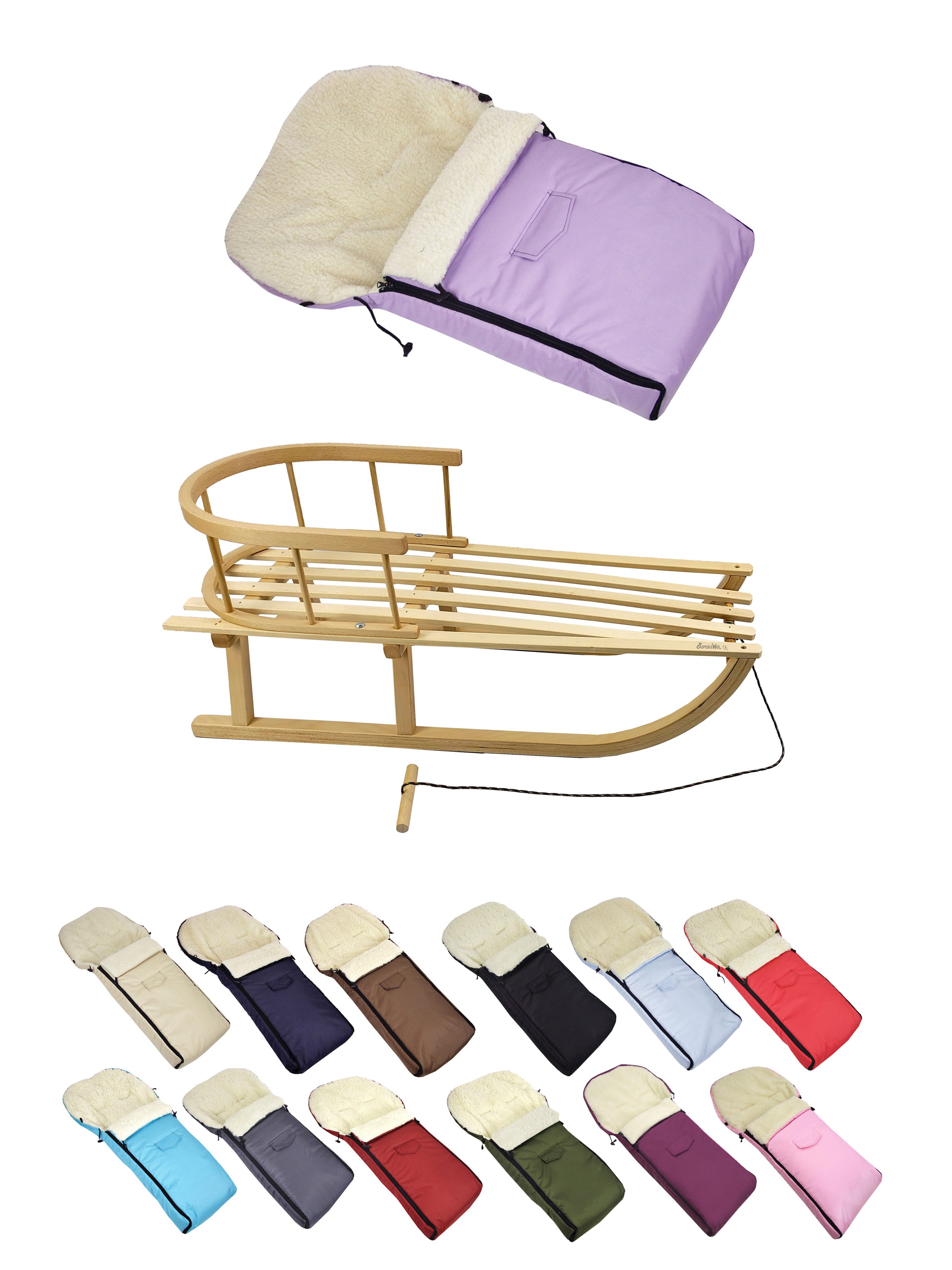 Details Material | aus Buchenholz, naturlackiert - Metallkufen, Bockstützen & Zugeisen pulverbeschichtet Winterfußsack: innen - mit Lammwolle, kuschelig und warm, aussen - hochwertiger Polyesterstoff, wind und wasserabweisend |
