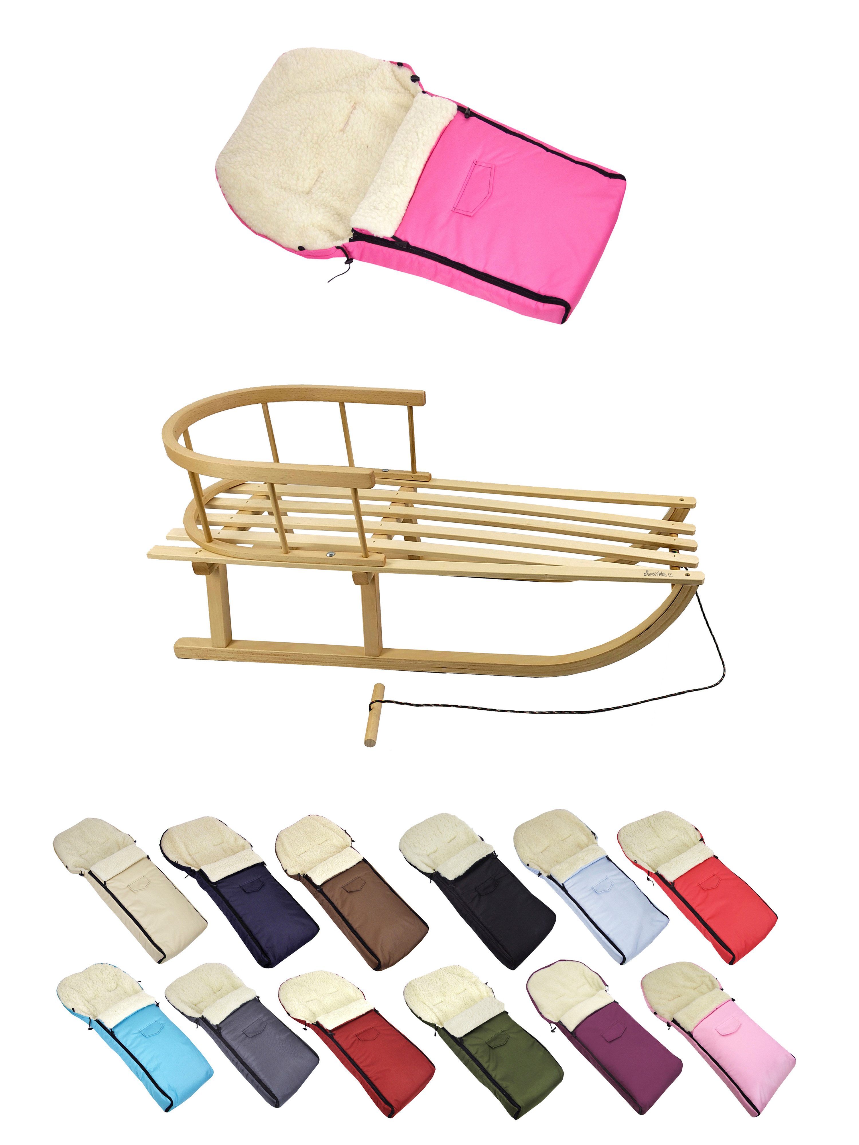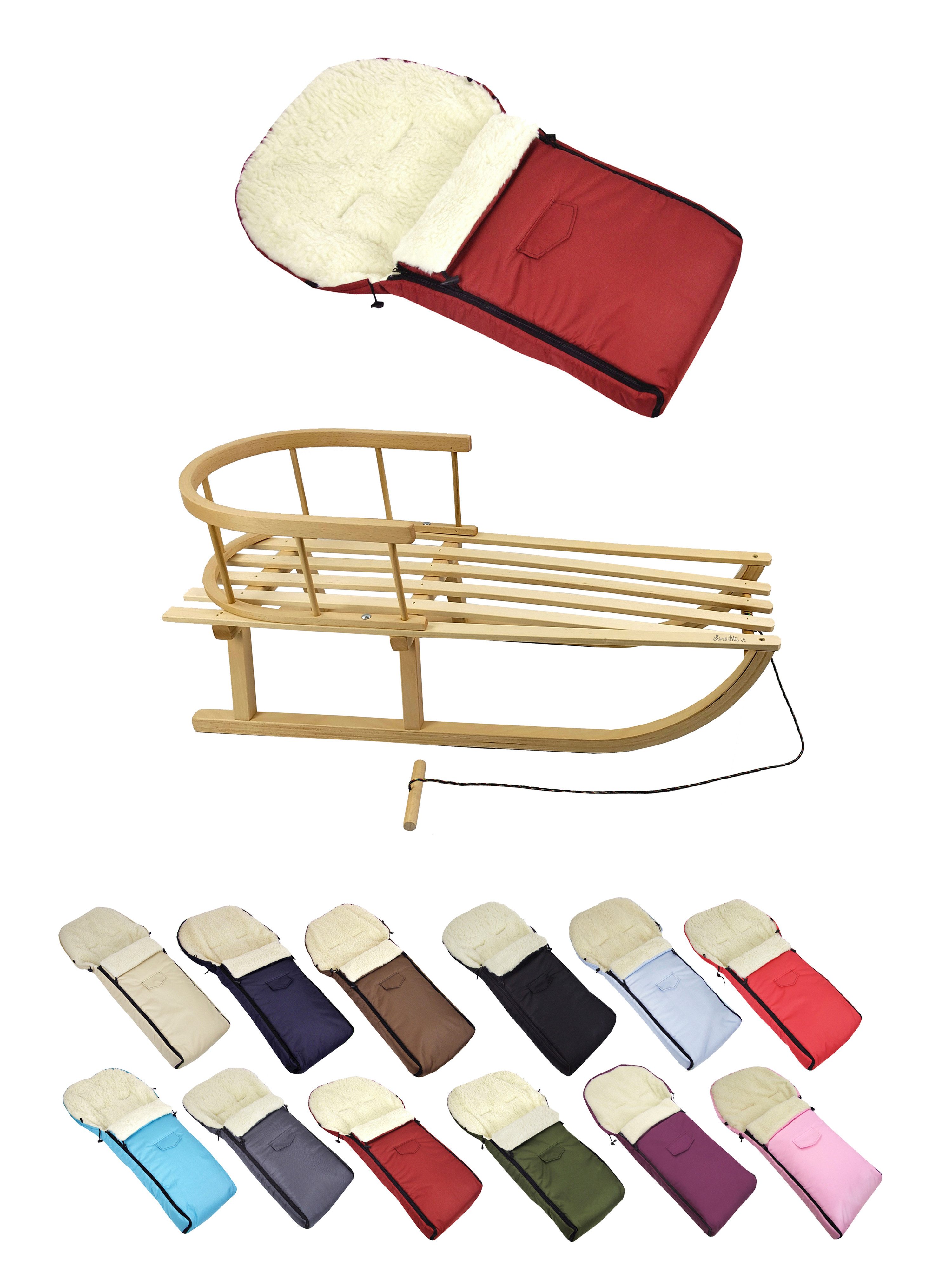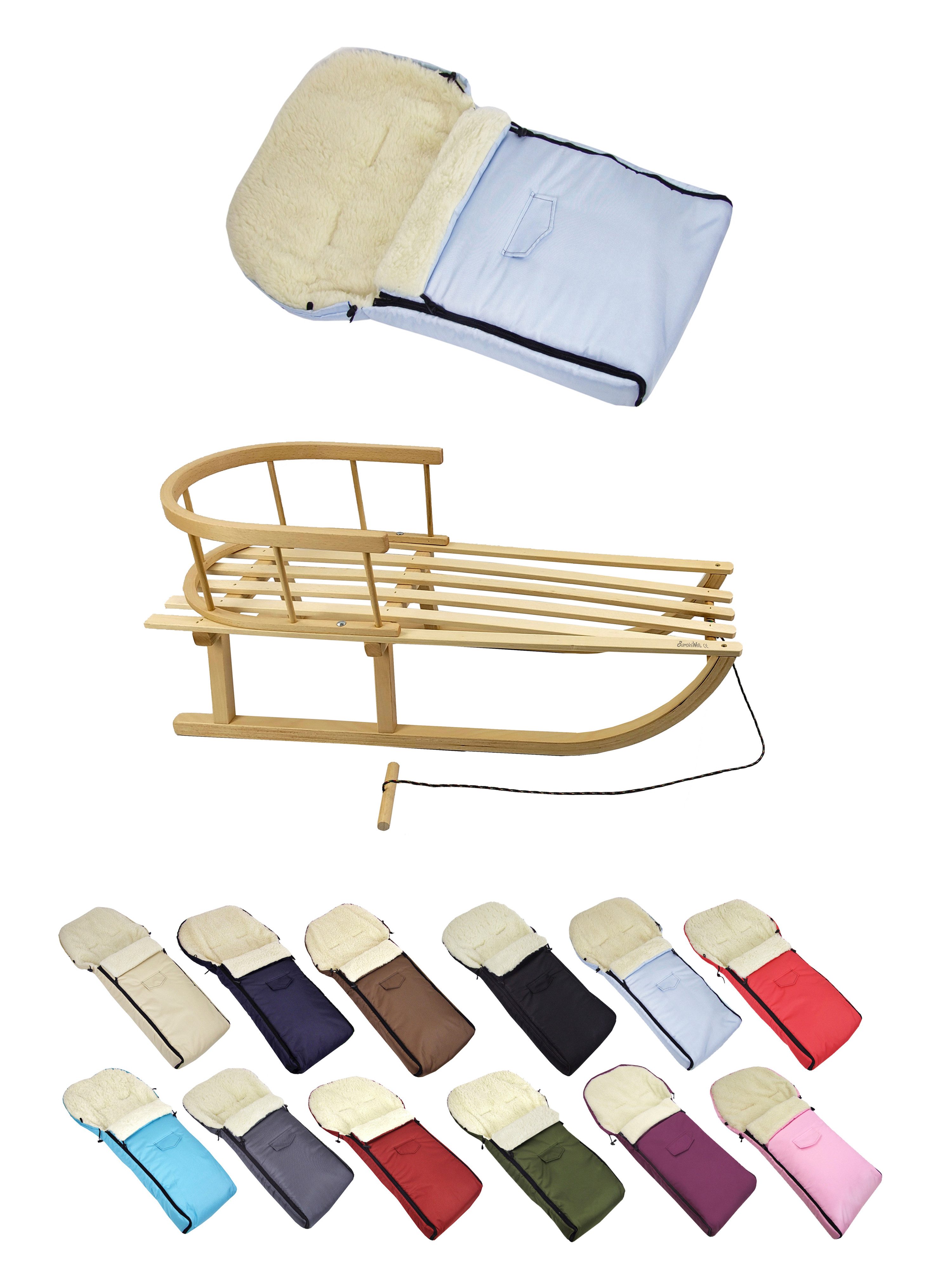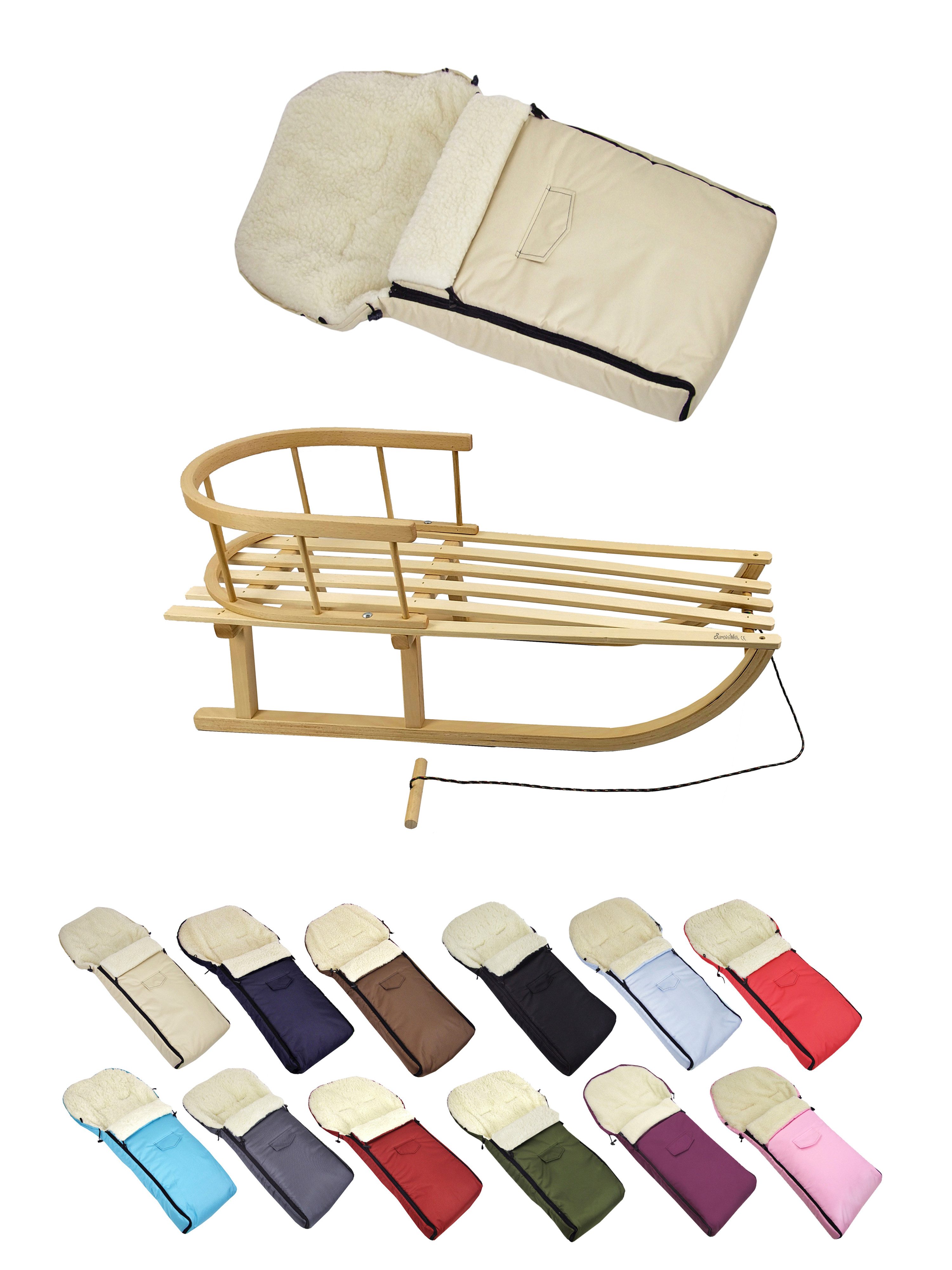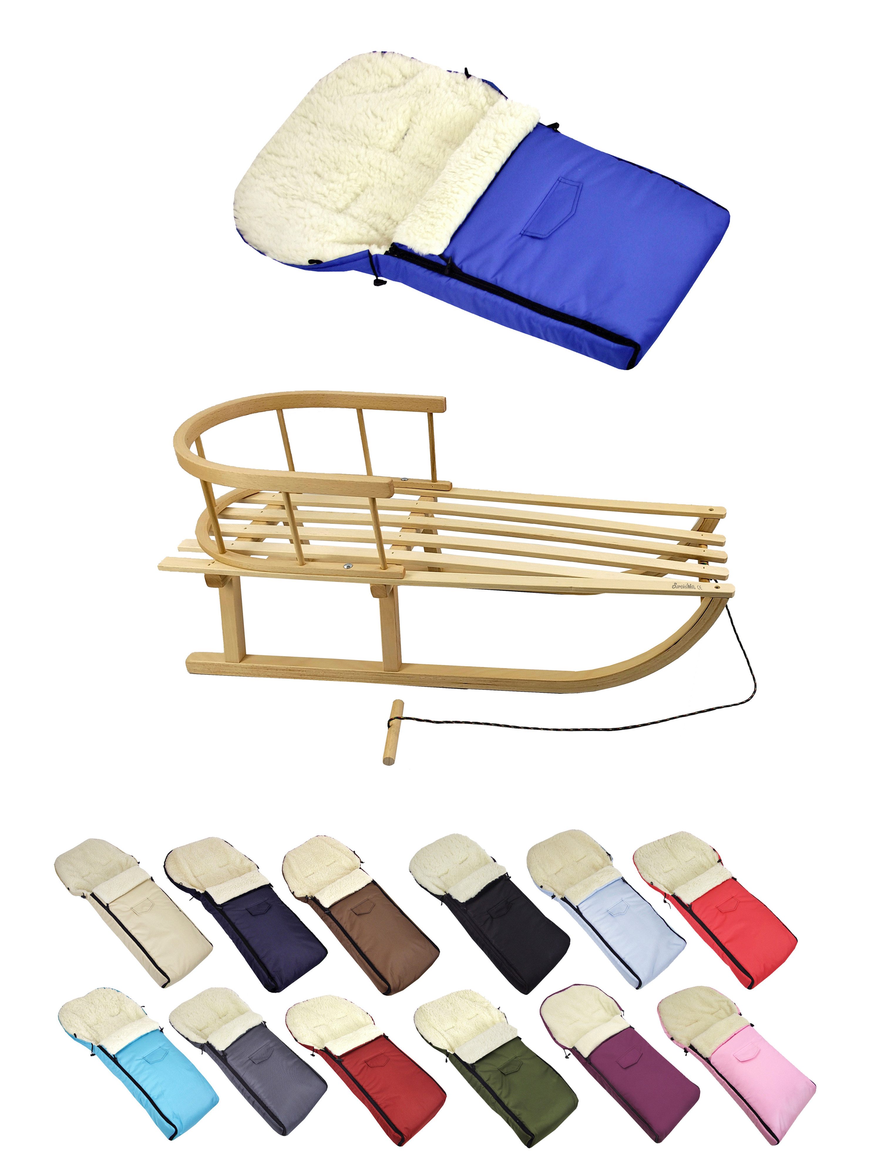 Details Material | aus Buchenholz, naturlackiert - Metallkufen, Bockstützen & Zugeisen pulverbeschichtet Winterfußsack: innen - mit Lammwolle, kuschelig und warm, aussen - hochwertiger Polyesterstoff, wind und wasserabweisend |