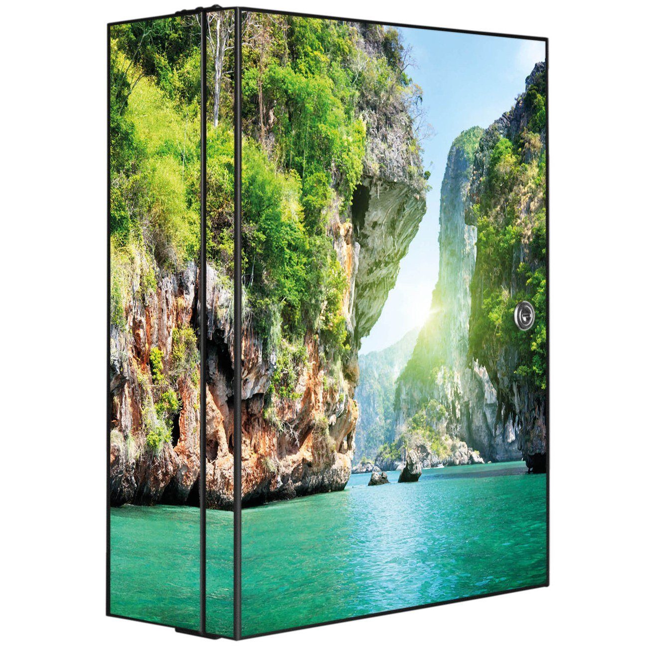 Der banjado Medikamentenschrank bietet Ihnen die Möglichkeit, Ihre Hausapotheke an einem festen Platz sicher aufzubewahren. Die Tür ist abschließbar sodass der Inhalt kindersicher und vor unberechtigtem Zugriff geschützt wird. Der Arzneischrank besteht aus weißem Metall das äußerst stabil ist. Das Innere des Badschranks teilt sich auf in drei große Fächer im Korpus sowie drei kleinere Ablagen an der Innenseite der Tür. Erhöhte Kanten an den Schrankeinlagen verhindern das Herausfallen von Gegenständen. Der Schrank ist gesamt 35x46x15cm groß, genügend Platz um Kosmetikartikel, Pflegeprodukte oder Medikamente gut geordnet unterzubringen. Gestaltet wird der Medizinschrank mit einer schutzlaminierten Dekorfolie die zusätzlich vor Kratzern schützt. Das individuelle Design sowie das hohe Maß an Funktionalität machen den Medizinschrank zu einem treuen Begleiter in Ihrem Alltag. Wir veredeln diesen Schrank von Hand in unserer kleinen Manufaktur in Dresden, es handelt sich also nicht um Importware, sondern um Handarbeit aus Sachsen. Sollten Sie kein passendes Motiv gefunden haben, können Sie uns auch gern eine Sonderanfertigungsanfrage stellen. Wir versuchen jeden Wunsch zu ermöglichen. Viel Freude beim Ordnung halten wünscht das banjado-Team aus Dresden!