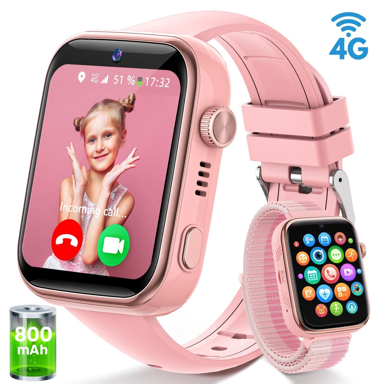 Die Kinder-Smartwatch unterstützt eine 4G-Nano-SIM-Karte (nicht im Lieferumfang enthalten) und ermöglicht schnelle, reibungslose Gespräche und Videoanrufe. Alternativ kann sie über WLAN verbunden werden, um Datenvolumen zu sparen und die Ortung noch stabiler zu machen. Darüber hinaus bietet die Uhr praktische Funktionen wie Schulmodus, Stundenplan, Lernkarten, Übersetzer und Taschenrechner. Zwei Armbänder – eines aus weichem Silikon und eines aus atmungsaktivem Stoff – sorgen für Abwechslung und Tragekomfort.