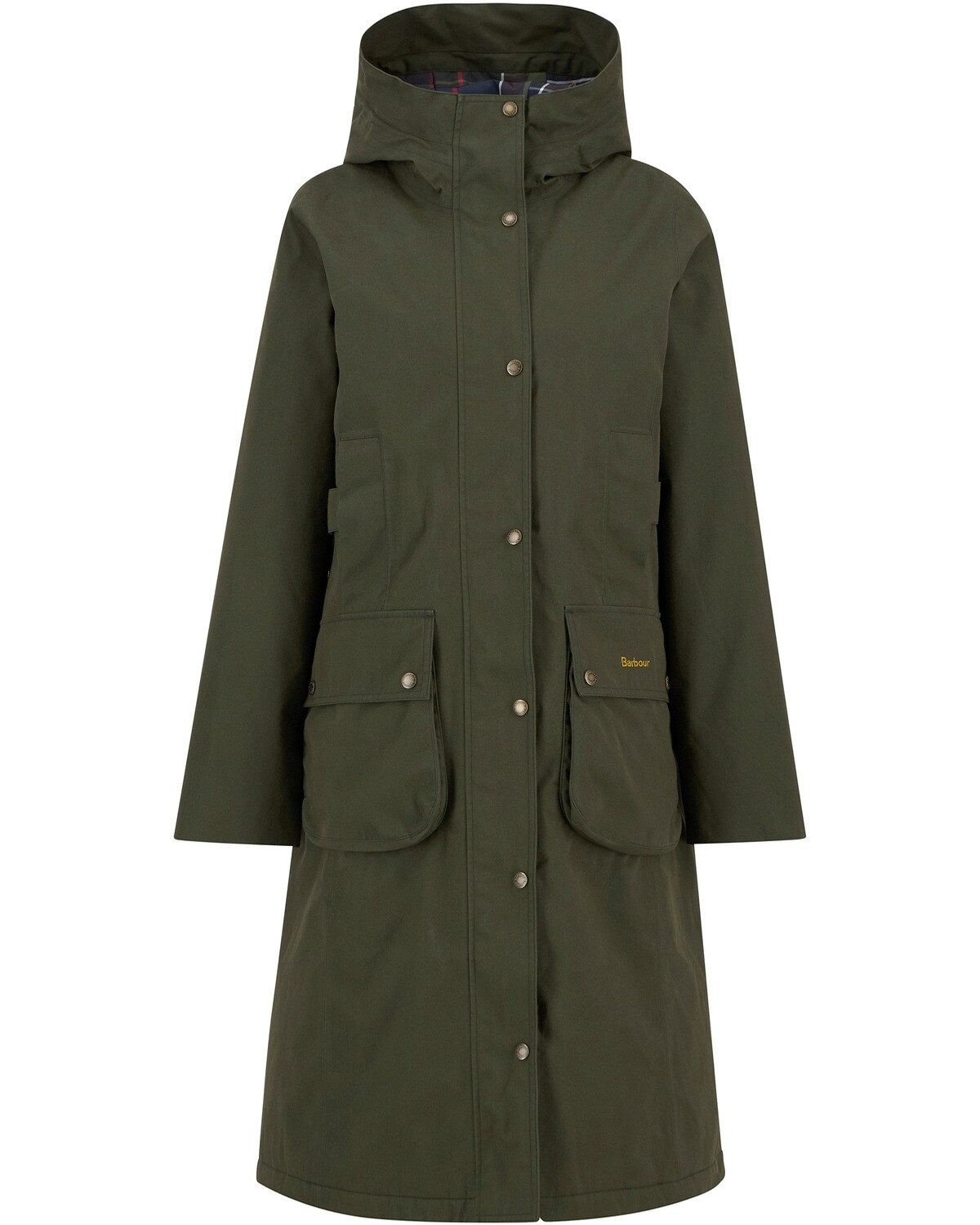 Der Damen Funktionsmantel Bamburgh von Barbour bietet mit seinem verlängerten Schnitt und wasserfesten Design optimalen Schutz bei nasskaltem Wetter. Ausgestattet mit einer fest integrierten Kapuze und gefüttert mit dem charakteristischen Barbour-Tartan, verkörpert der Mantel den unverkennbaren British Country Style. Der weiche, matte Griff des Materials sorgt für ein angenehmes Tragegefühl, während der 2-Wege-Frontreißverschluss mit Druckknopfblende für Flexibilität sorgt. Raffinierte Details und stilvolle Akzente