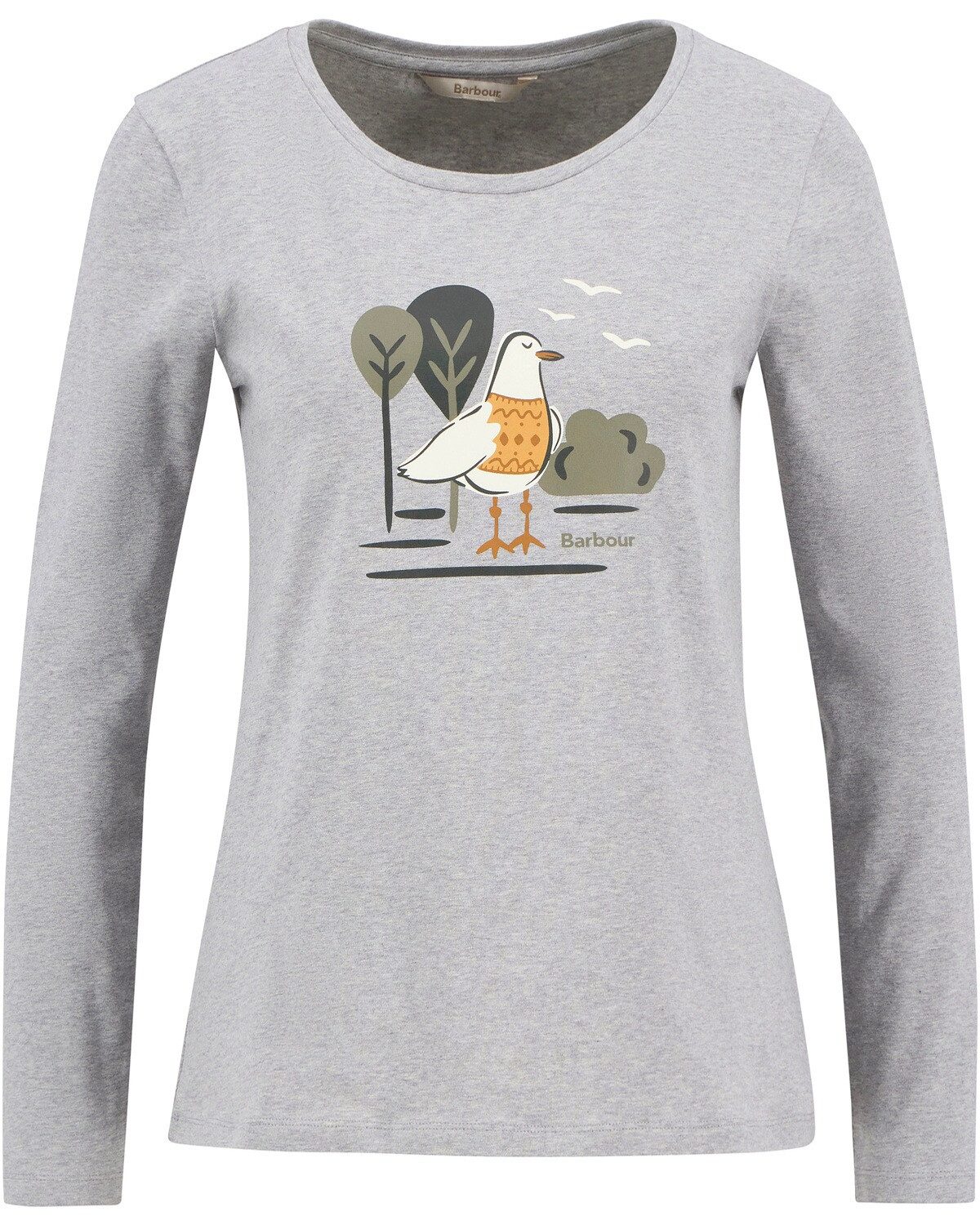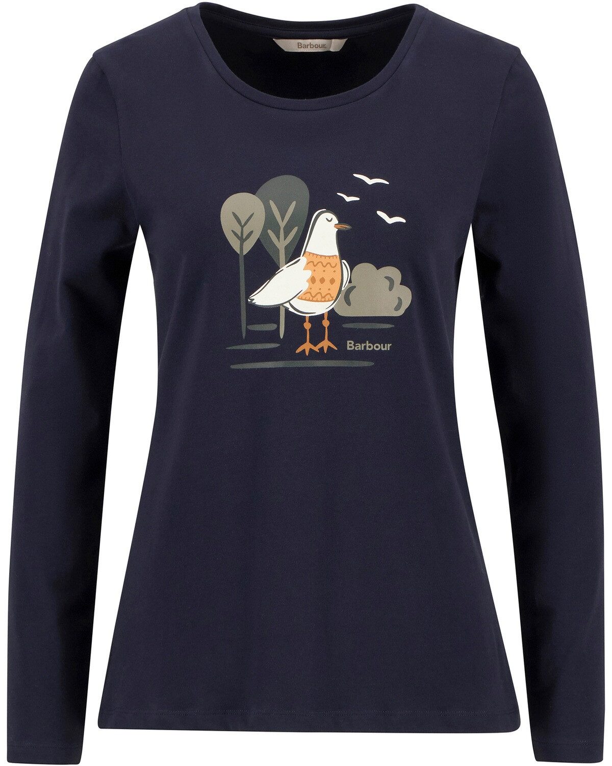 Stilvolles Design mit saisonalem Flair Das Damen Langarmshirt Lossie von Barbour verbindet einen komfortablen Schnitt mit einem charmanten Design, das perfekt für Herbst- und Wintertage geeignet ist. Auf der Vorderseite zeigt sich eine liebevoll gestaltete Grafik mit einer Barbour-Möwe im Pullover, die dem Shirt einen besonderen Akzent verleiht. Dieser grafische Hingucker macht das Shirt zu einem stilvollen Begleiter für Freizeitaktivitäten und entspannte Tage im Freien. Bequemlichkeit und perfekte Passform Gefertigt aus trageangenehmem Baumwollmaterial mit Stretchanteil, bietet das Shirt ein weiches und komfortables Tragegefühl, das Bewegungsfreiheit und Flexibilität gewährleistet. Der Rundhalsausschnitt und die langen Ärmel setzen klassische Akzente, während der Slim Fit eine schmeichelhafte Passform schafft, die die Silhouette vorteilhaft betont. Das Damen Langarmshirt Lossie ist eine ausgezeichnete Wahl für alle, die Wert auf Komfort und stilvolles Design legen. Oberstoff: 94% Baumwolle, 6% Elasthan
