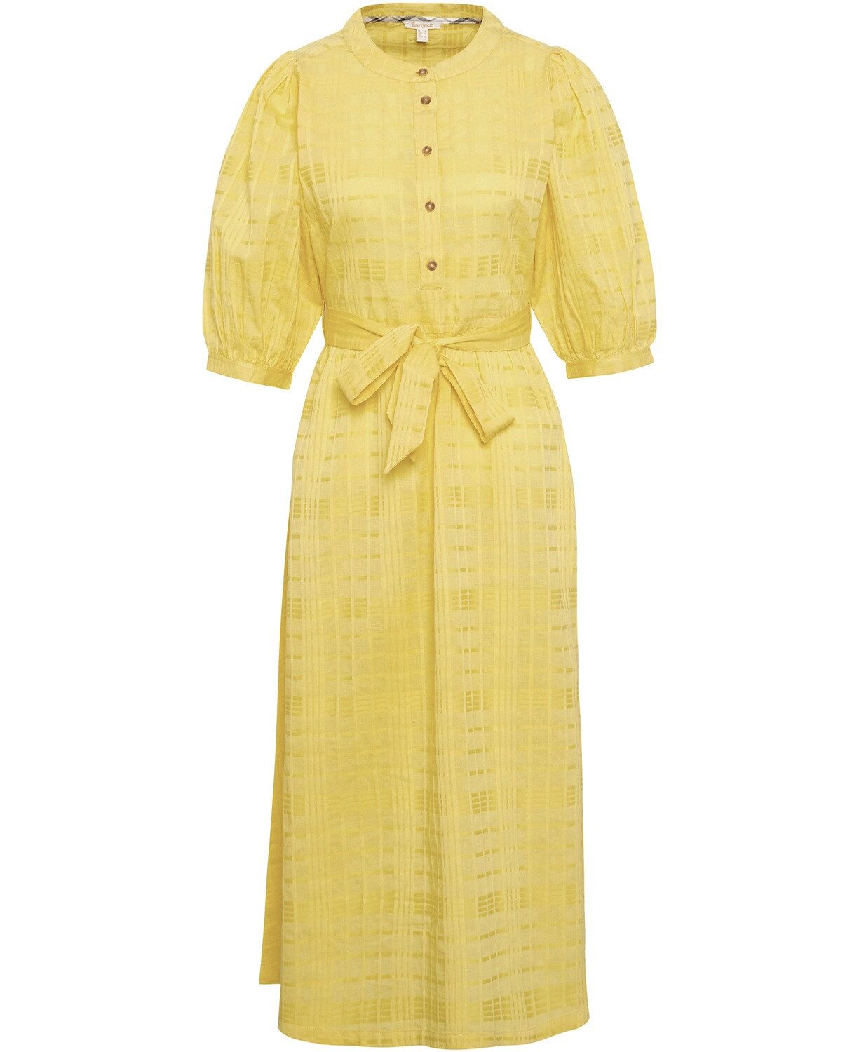 Eleganz trifft auf Komfort: das Barbour Kleid Heidi Ein Kleid, das die Herzen höherschlagen lässt: das Barbour Kleid Heidi in der strahlenden Farbe Sunray Yellow vereint zeitlose Eleganz mit einem Hauch von Verspieltheit. Stilvolles Design mit liebevollen Details Das Barbour Kleid Heidi besticht durch sein einzigartiges Windowpane-Karo-Muster, das dem Midi-Kleid eine klassische Note verleiht. Die elastischen Puffärmel sorgen für einen romantischen Touch und bieten gleichzeitig hohen Tragekomfort. Der halbe Verschluss in der vorderen Mitte verleiht dem Kleid eine subtile Raffinesse, während der Gürtel die Taille perfekt betont und eine feminine Silhouette zaubert. Praktische Eleganz Neben seiner stilvollen Optik überzeugt das Kleid auch durch praktische Details. Die seitlichen Nahttaschen bieten Platz für kleine Alltagsgegenstände und machen das Kleid zu einem funktionalen Begleiter. Ein besonderes Highlight ist das abnehmbare Baumwoll-Cami, das zusätzliche Vielseitigkeit bietet und je nach Anlass getragen werden kann. Hochwertige Materialien für ein angenehmes Tragegefühl Das Barbour Kleid Heidi besteht aus Baumwolle, sowohl im Außenmaterial als auch im Futter. Diese hochwertige Materialwahl garantiert ein angenehmes Tragegefühl und sorgt dafür, dass man sich den ganzen Tag über wohlfühlt. Die schmalen ID-Bars am Rücken und die markentypischen Hornimitatknöpfe an den Manschetten und der Knopfleiste unterstreichen die hohe Qualität und Liebe zum Detail, die in jedem Barbour Kleid steckt. Pflegeleicht und langlebig Das Kleid kann problemlos bei 30°C im Schonwaschgang in der Maschine gewaschen werden, was die Pflege besonders einfach macht. So bleibt das Kleidungsstück lange schön und behält seine strahlende Farbe und Form. Oberstoff: 100% Baumwolle; Futter: 100% Baumwolle