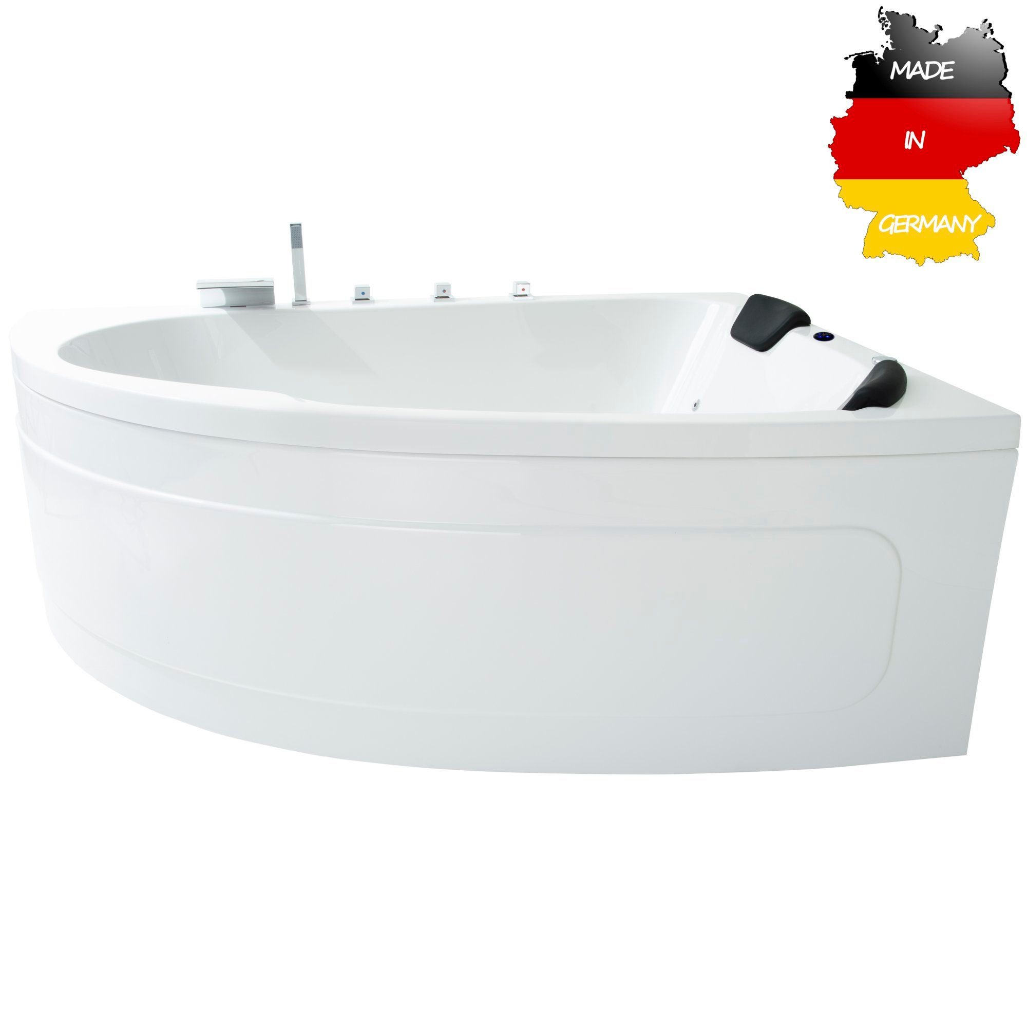 Der Whirlpool besteht aus hochwertigem reinem Sanitäracryl. Dieses Qualitätsmerkmal sorgt für eine optimale Wärmespeicherung sowie für ein angenehmes, warmes Hautgefühl beim Einsteigen in die Badewanne. Darüber hinaus wird im Laminierverfahren eine Glasfaserverstärkung auf die Außenseite der Eckwanne aufgetragen. Einzeln höhenverstellbare Füße schaffen einen Bodenausgleich von bis zu 10 cm. Das Fußgestell ist aus massivem rostfreiem Stahl und alle Eisenkleinteile sind von der deutschen Qualitätsmarke Würth.