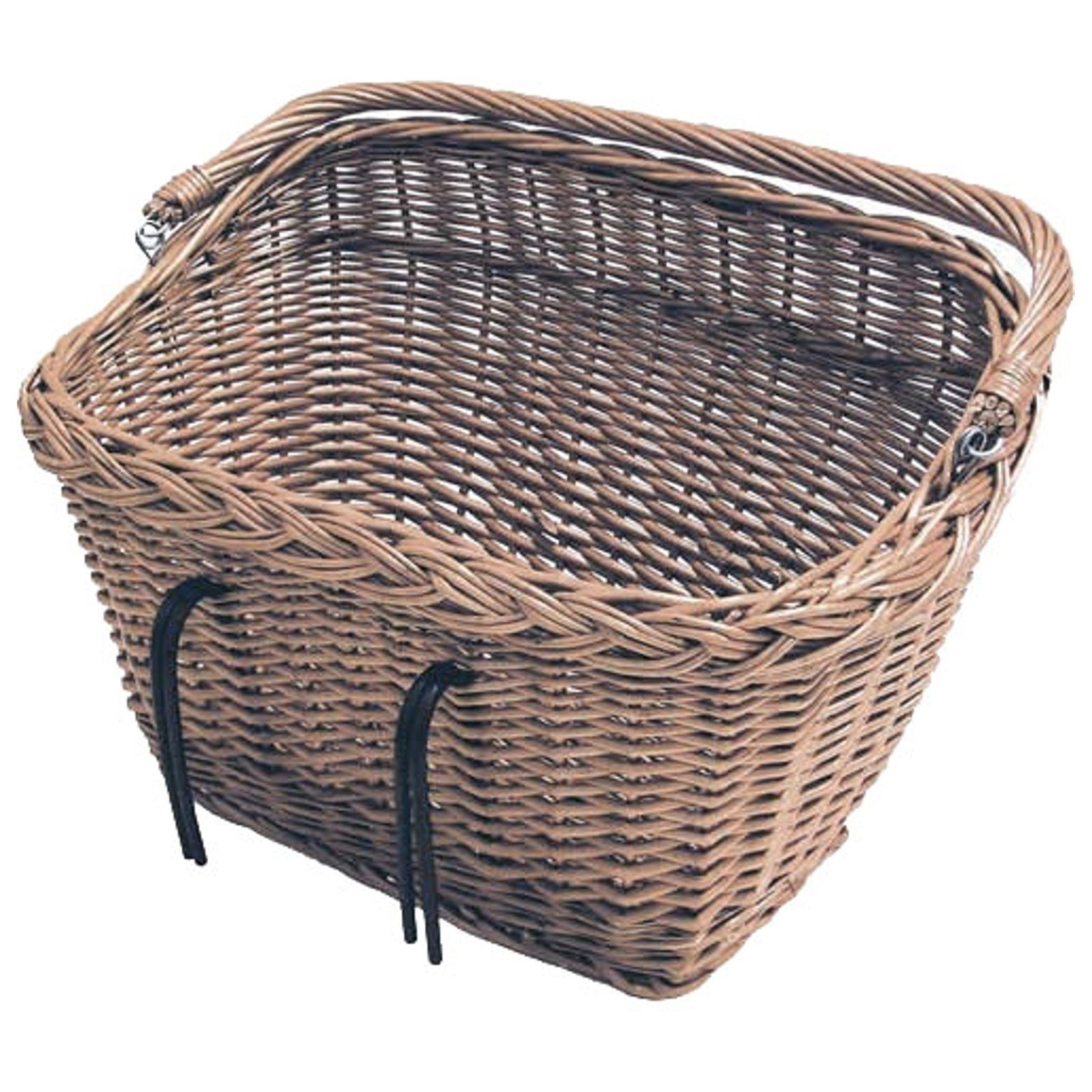 Basil Dublin VR - rechteckiger Weidenkorb in Braun, mit Doppelhaken zur Montage vorne am Lenker oder am Gepäckträger, inklusive Tragebügel, naturlackiert und alltagstauglich.