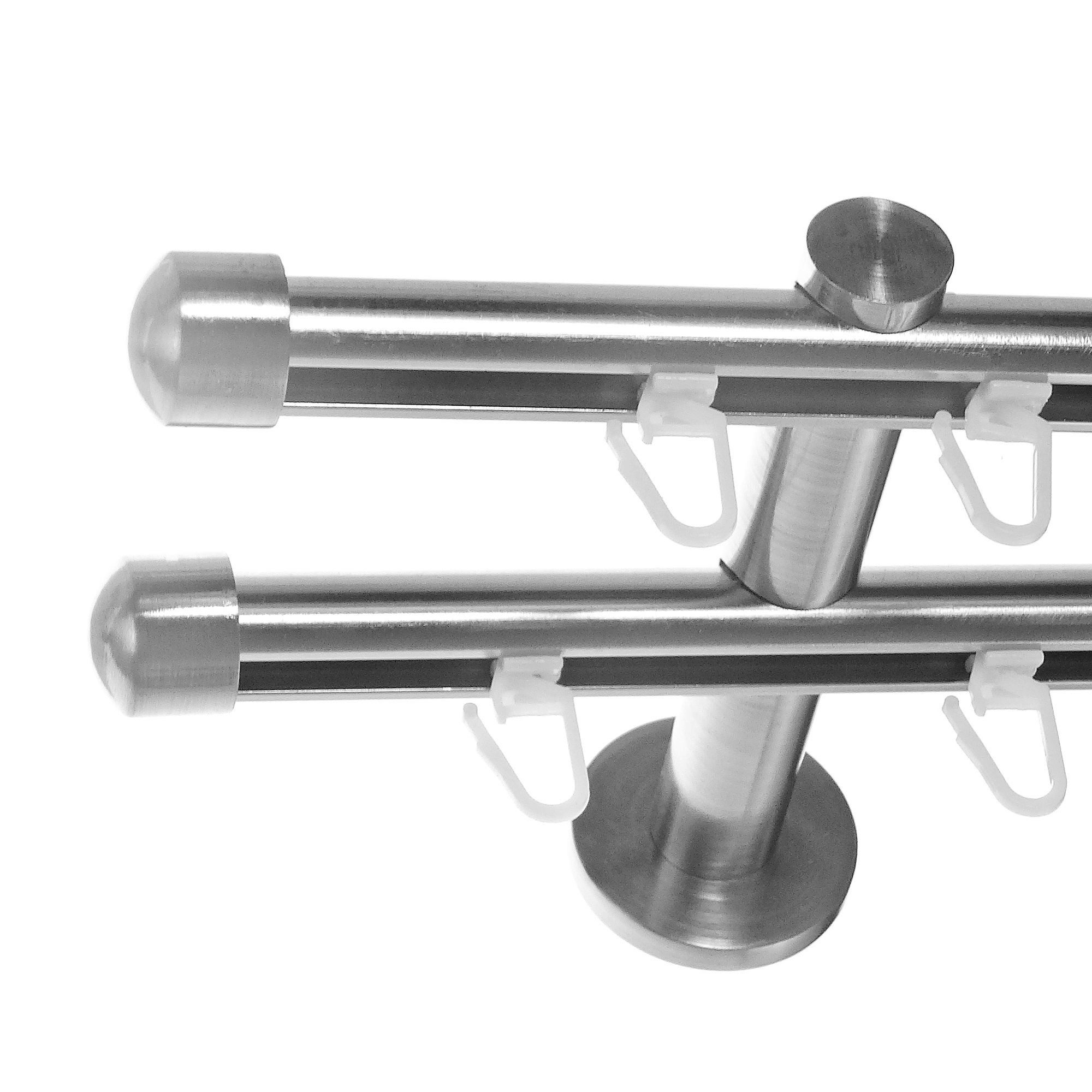 Lieferumfang: 1 Stück Gardinenstangenset doppelläufig. Das hintere Endstück ist immer die schlichte Kappe E17, das vordere Endstück je nach Auswahl.