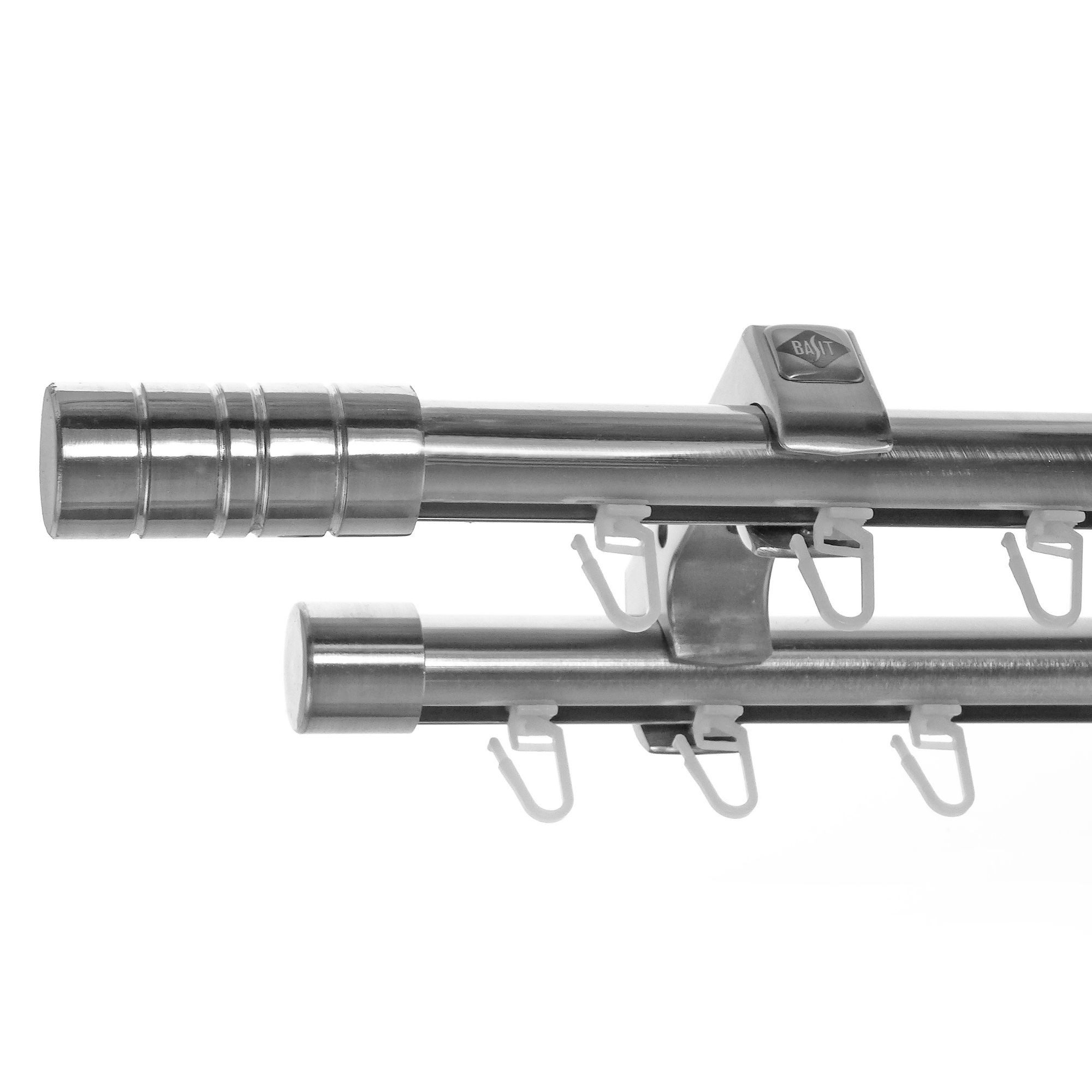 Lieferumfang | Gardinenstangen bis 2 m: 2 Stangen, 2 Träger, 2 Endstücke (wählbar) vorne und 2 Endstücke (E30) hinten.Gardinenstangen über 2 bis 4 m: 4 Stangen, 2 Rohrverbinder, 3 Träger, 2 Endstücke (wählbar) vorne und 2 Endstücke (E30) hinten.Gardinenstangen über 4 bis 6 m: 6 Stangen, 4 Rohrverbinder, 4 Träger, 2 Endstücke (wählbar) vorne und 2 Endstücke (E30) hinten.Es ist für alle 10 cm je ein X-Gleiter mit Faltenhaken im Lieferumfang enthalten. |