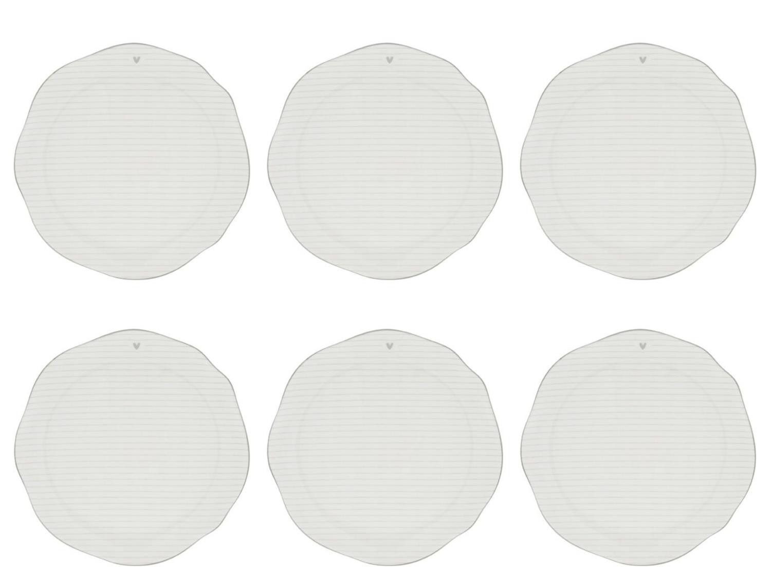 • Lieferumfang: 6 weiße Frühstücksteller mit grauen Streifen und kleinem Herz