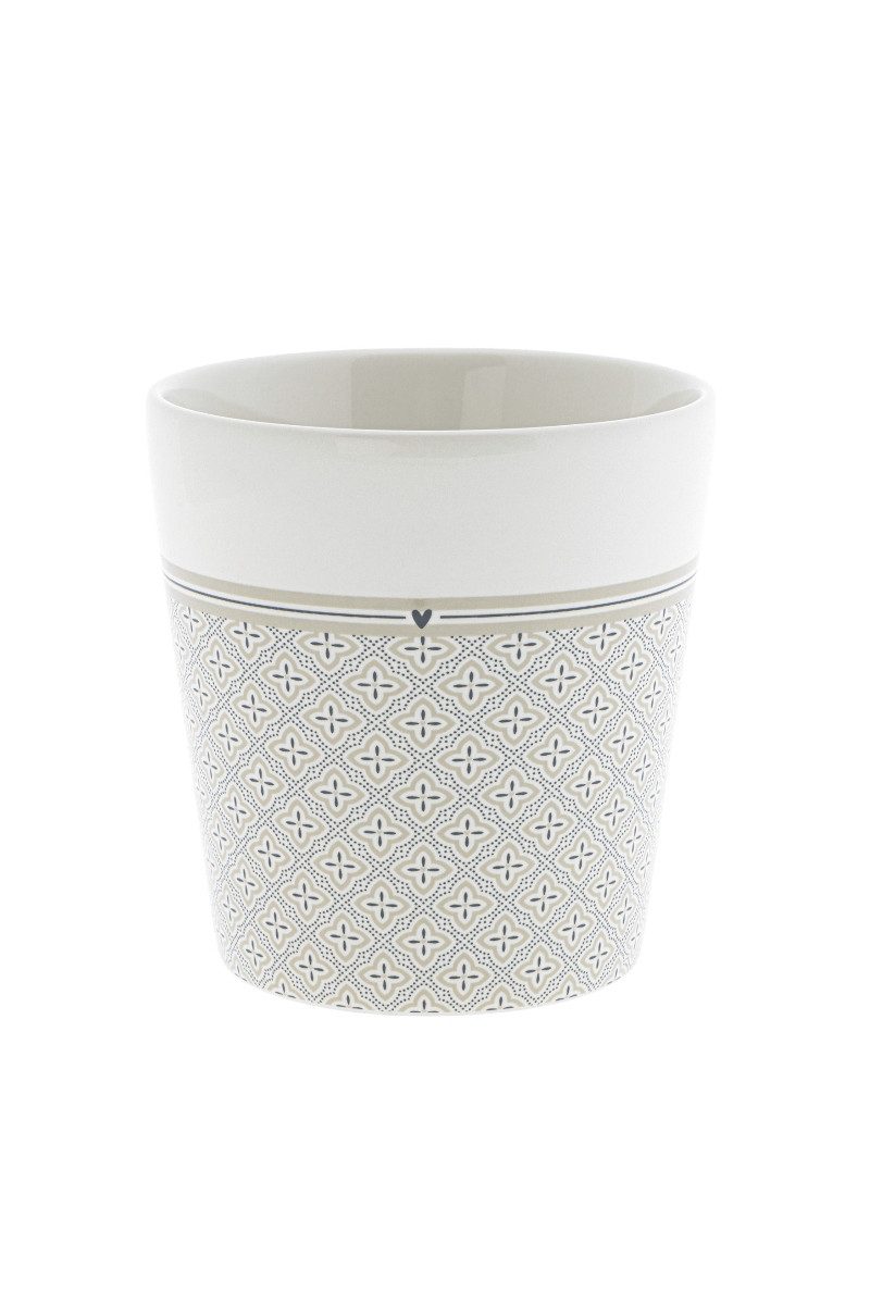 Dieser stilvolle, handbemalte Becher "Little Mosaik" im Scandi-Look besteht aus Keramik und hat im unteren Bereich ein geschmackvolles Muster aus stilisierten Blüten in Titan und zarten Pünktchen in Anthrazit im Rautengitter-Look sowie ringsum feine Linien in Titan mit einem kleinen Herzchen in Anthrazit. Der Keramikbecher ist perfekt für Heiß- und Kaltgetränke, Eis, Desserts usw..