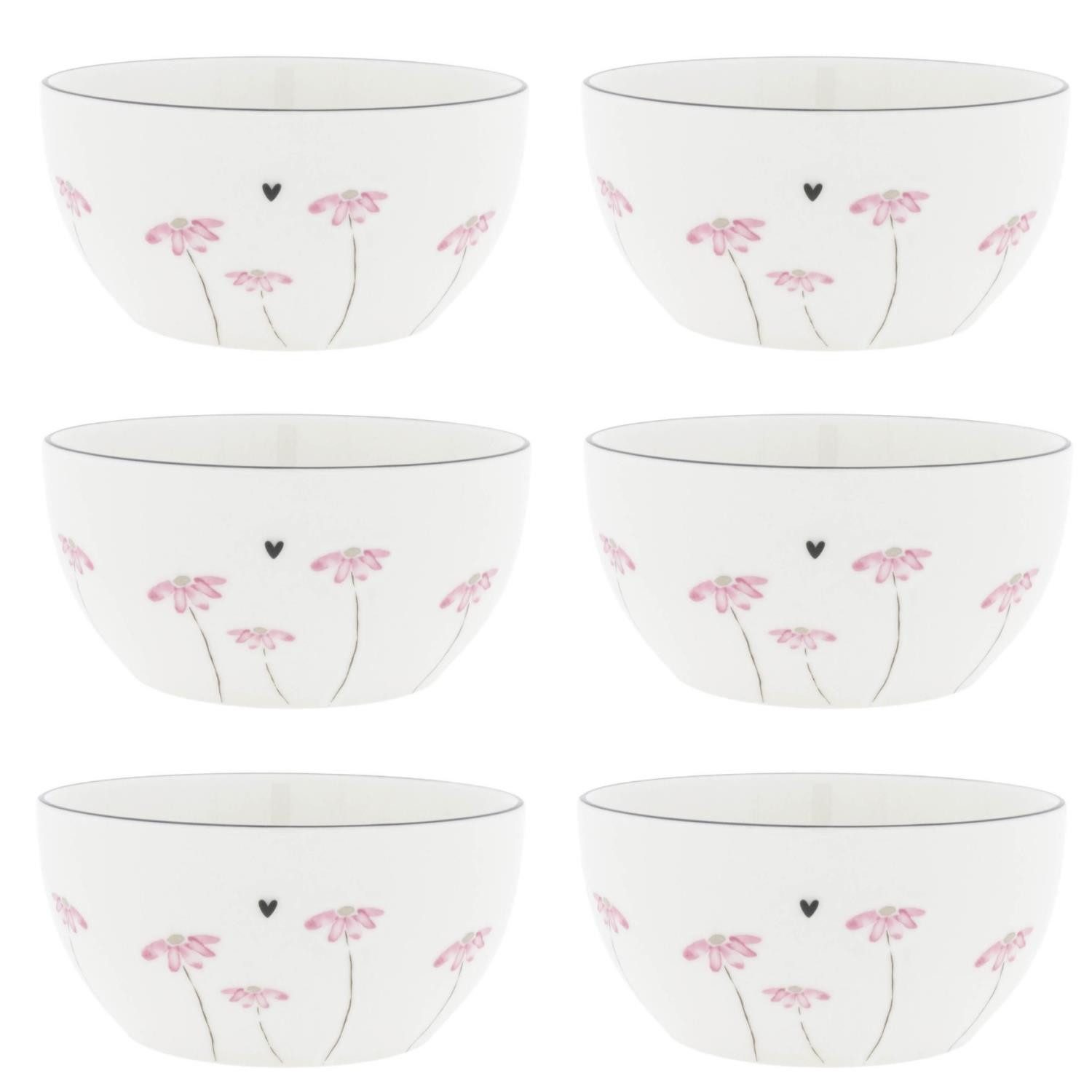 Lieferumfang: 6 Müslischalen Watercolour Flower weiß mit rosafarbenen Blumen und kleinem Schwarzen Herz und schwarzem Rand