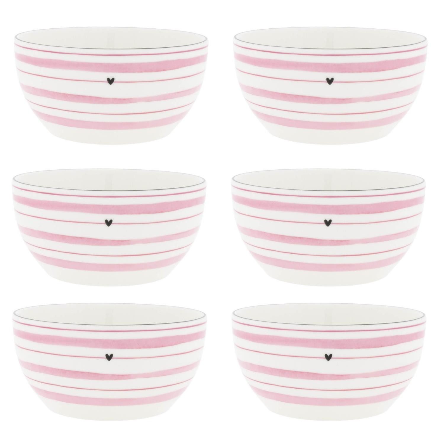Lieferumfang: 6 Müslischalen Watercolour Stripes weiß mit rosafarbenen Streifen und kleinem Schwarzen Herz und schwarzem Rand
