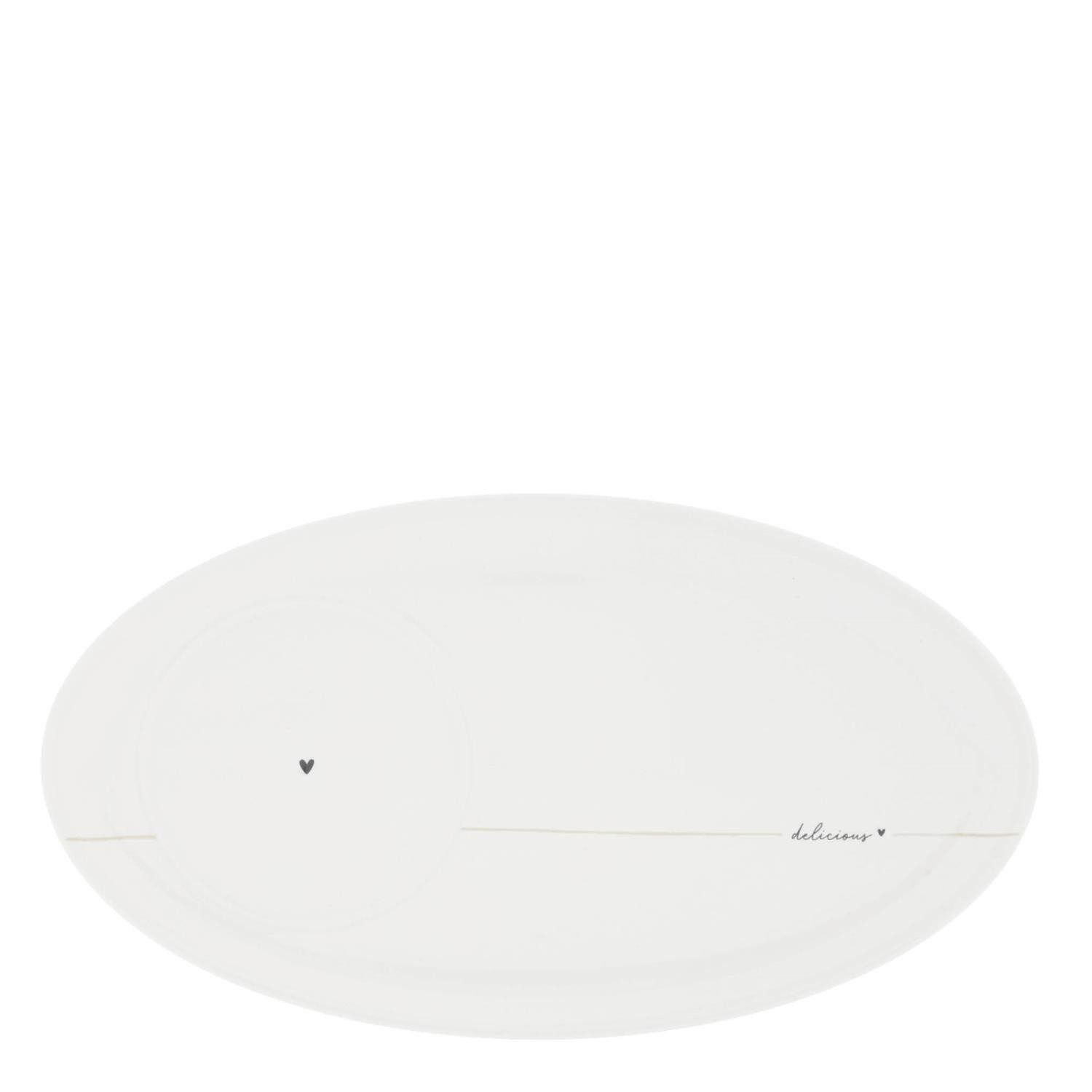 • Lieferumfang: 1 Servierplatte Unterteller Delicious oval mit kleinem schwarzen Herz aus weißer Keramik
