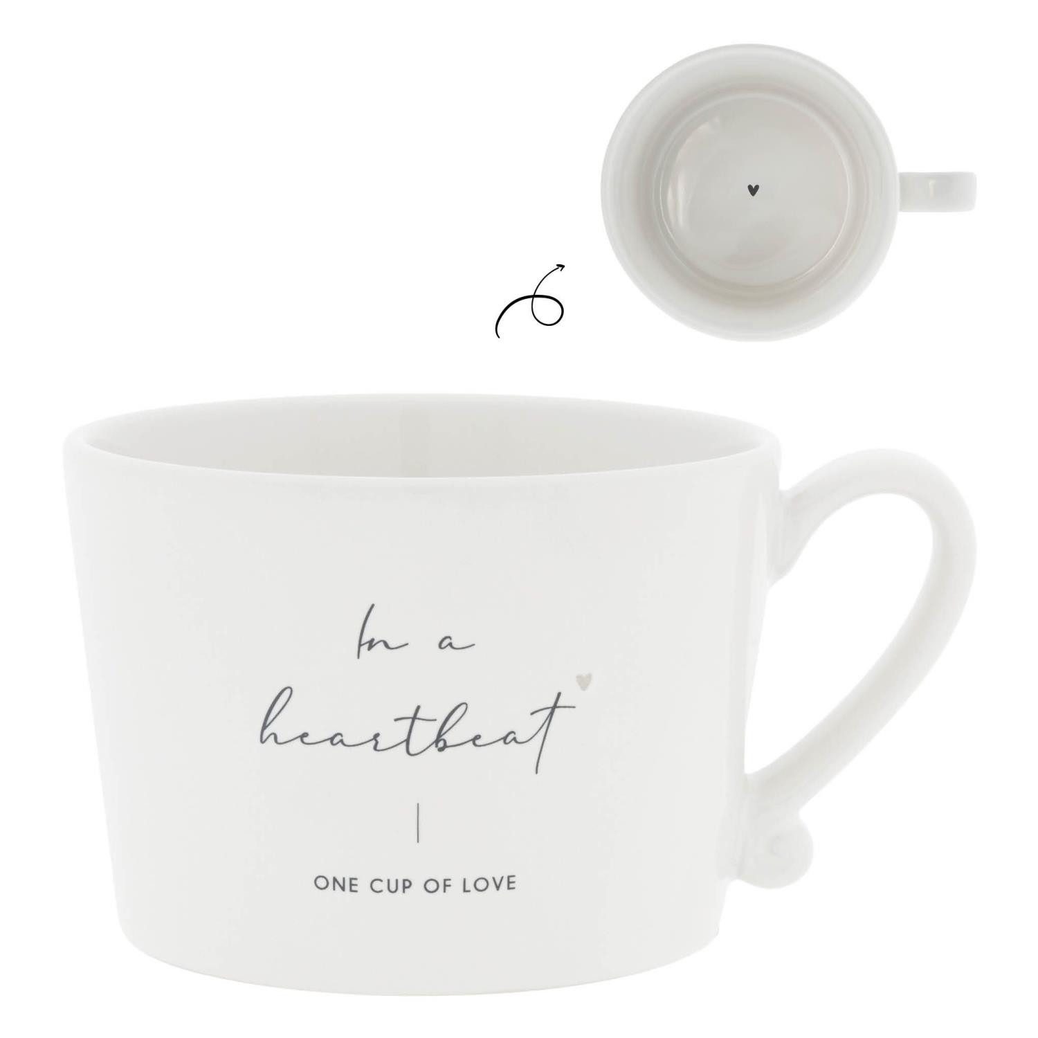 Lieferumfang: 1 weiße Tasse mit schwarzem in a Heartbeat Schriftzug und kleinem Herz Maße: Höhe: 7cm, Durchmesser: 10cm, Длина mit Henkel 12,8cm Füllmenge: 270ml Farbe: weiß glänzend mit schwarz Material: Keramik spülmaschinenfest und mikrowellengeeignet