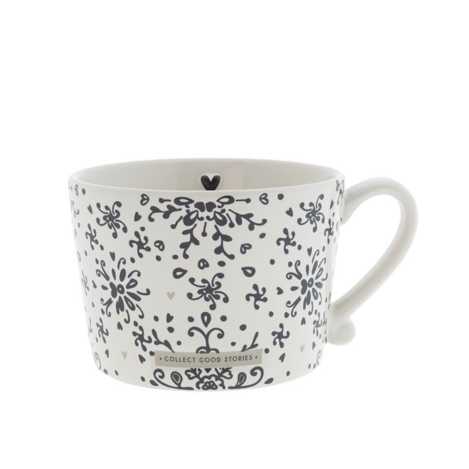 Lieferumfang: 1 Tasse mit abstraktem Blumenmotiv, kleinem Herz auf der Innenseite der Tasse und Schriftzug Collect good stories