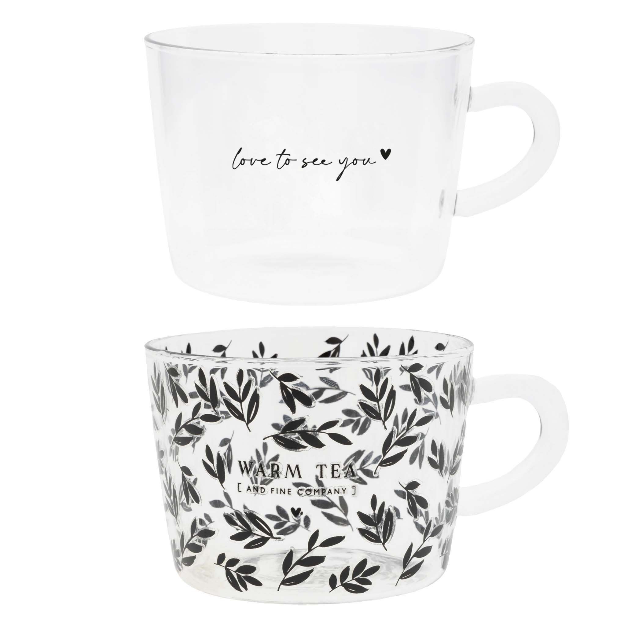 Lieferumfang: 2 verschiedene Glastassen mit Herzmotiv, Blätterranken und Schriftzug Warm Tea & Love to see you im Set