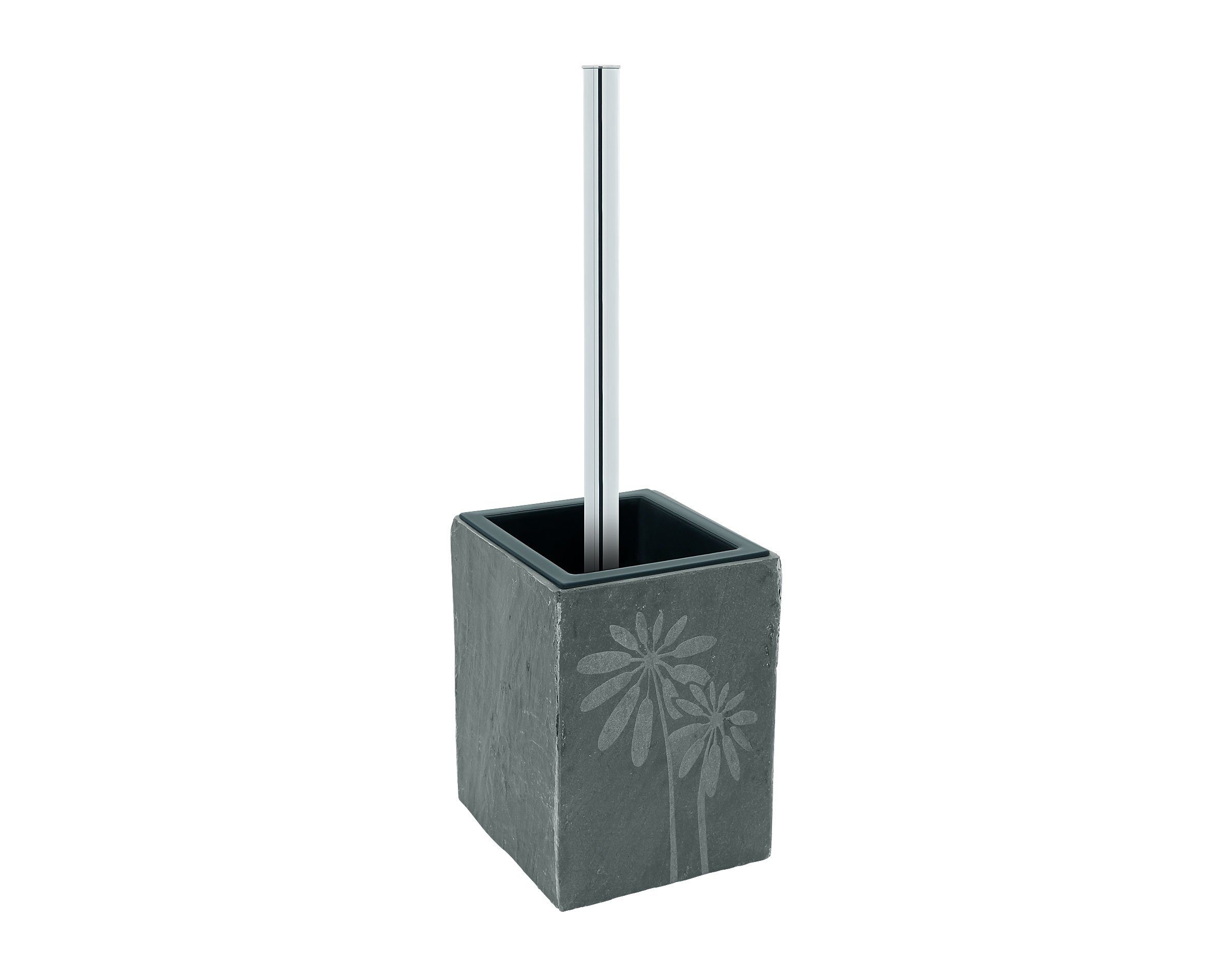 Die Accessoire Serie Jura besteht aus echtem Naturschiefer. Mit ihrer ursprünglichen, naturbelassenen Maserung ist jedes Teil etwas anders und ganz individuell. Das Blütenmotiv ist auf einer Seite eingraviert. Sie können ganz nach Wunsch und Tagesform mal die dekorierte Seite in den Vordergrund drehen oder eine der schlichten Seiten. Der Bürstenstiel ist glänzend verchromt und passt zu den meisten Armaturen. Auf jeden Fall verleiht die Serie Jura mit ihrem geradlinigen, rechteckigen Design jedem Bad ein besonders modernes und puristisches Ambiente.