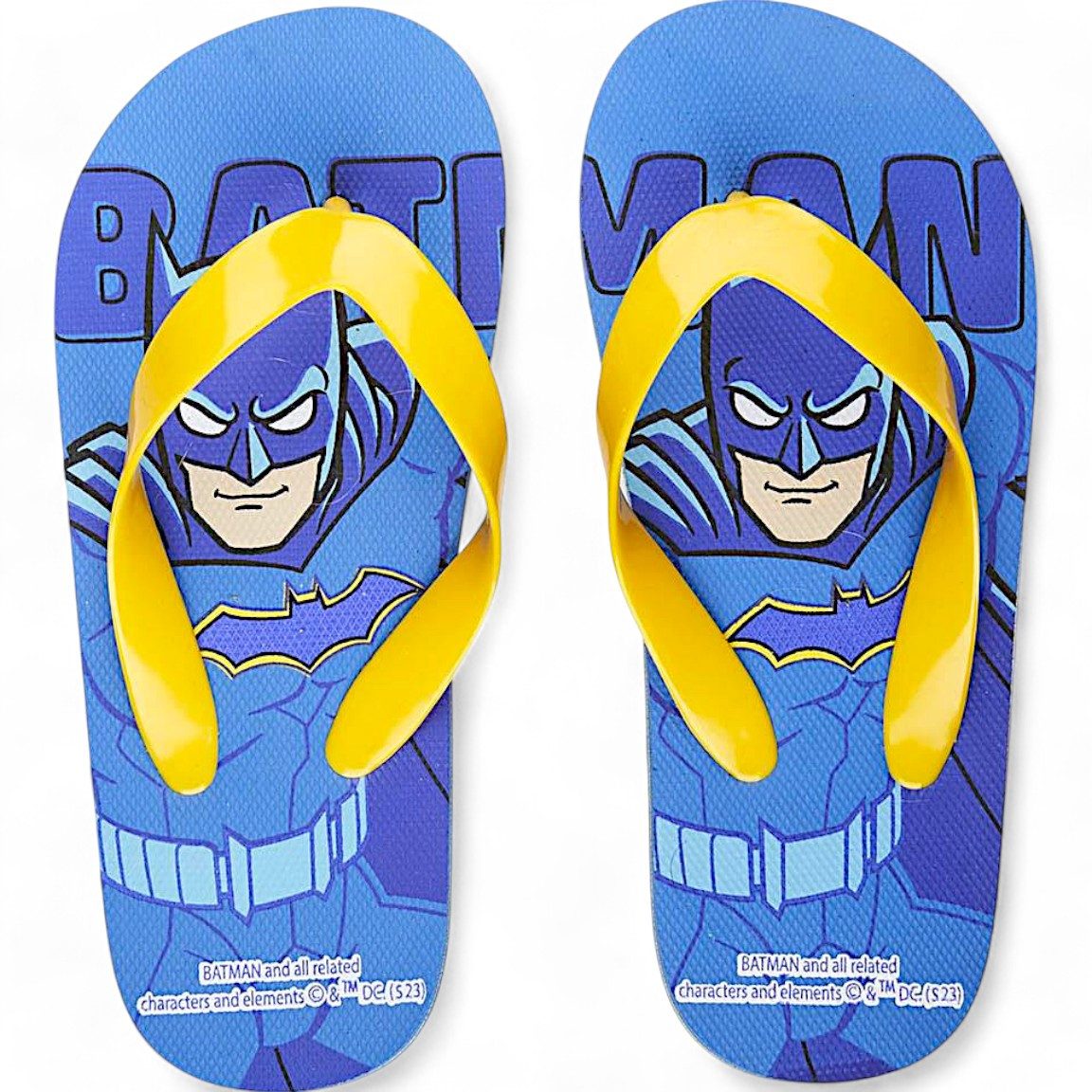 Diese coolen Batman-Zehentrenner bringen kleine Helden stilvoll durch den Sommer! Mit dem markanten Design in Blau und Gelb, das den legendären Superhelden zeigt, sind sie der perfekte Begleiter für sonnige Tage.