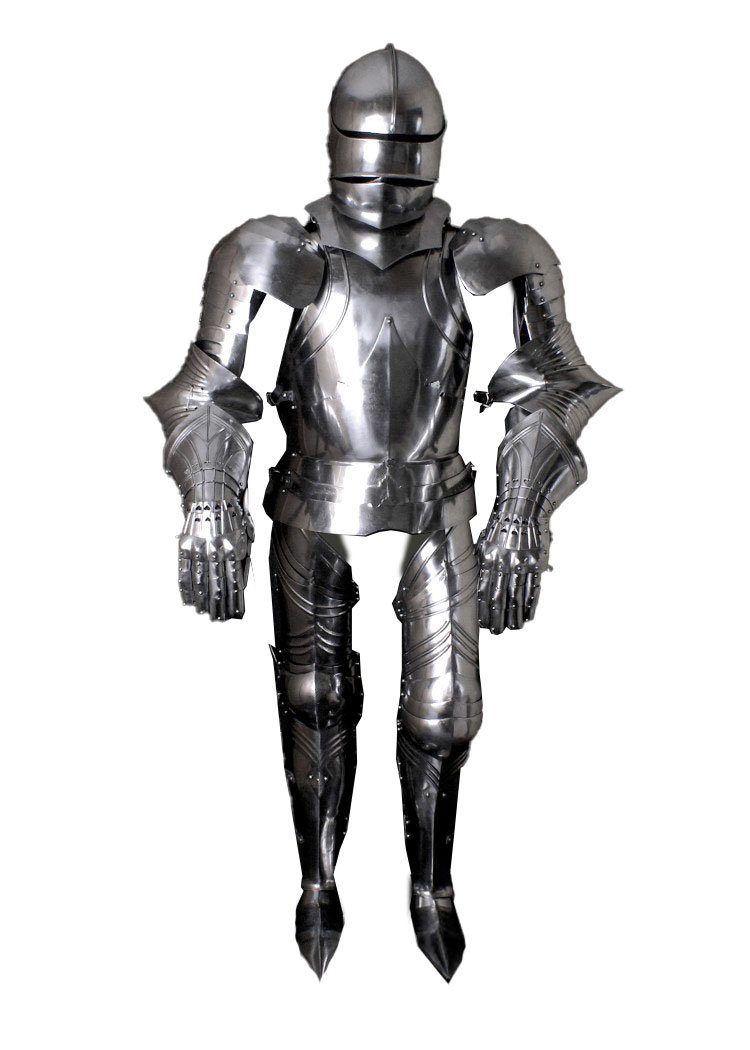 Dieses preiswerte Set einer kompletten Plattenrüstung ist ein echter Hingucker. Die Rüstung wurde nach Vorbildern des späten 15. Jahrhundert gefertigt. Verwendet wurde dafür solides Stahlblech, welches in aufwendiger Handarbeit zu dieser Rüstung verarbeitet wurde. Die Rüstung kann getragen werden, da alle Teile beweglich sind. Der Träger sollte ca. 1,75-1,80m groß sein