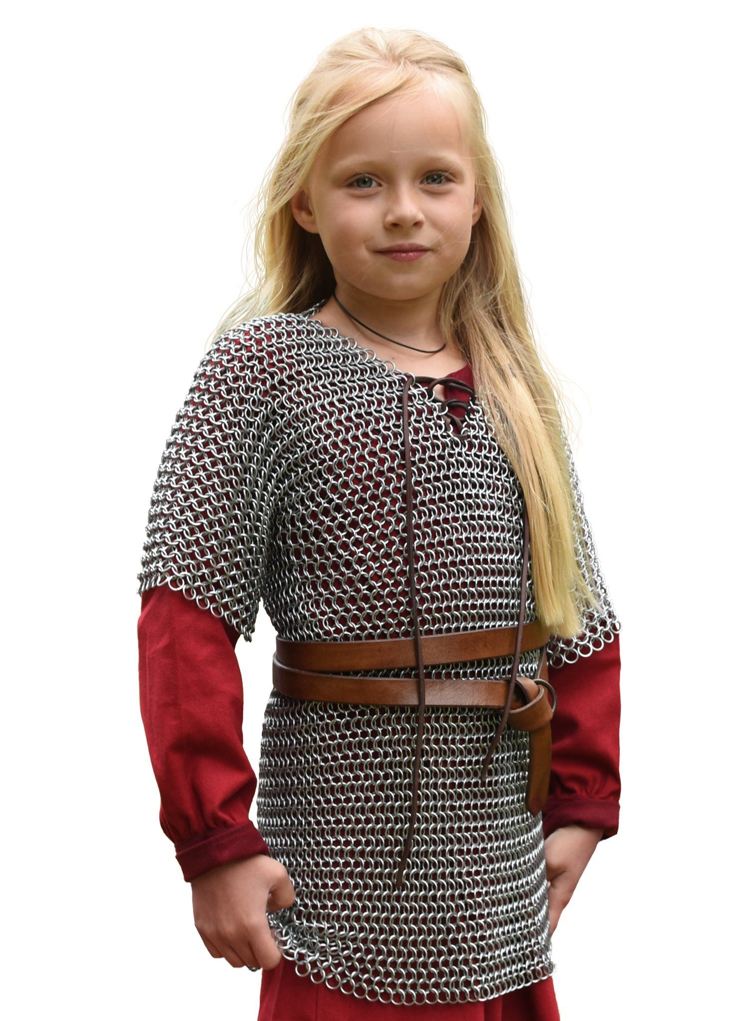 Dieses tolle Kurzarm-Kettenhemd für Kinder ist perfekt für die ersten Larp-Erfahrungen. Es lässt sich durch die Lederband Schnürung im Halsbereich sehr gut an- und ausziehen.