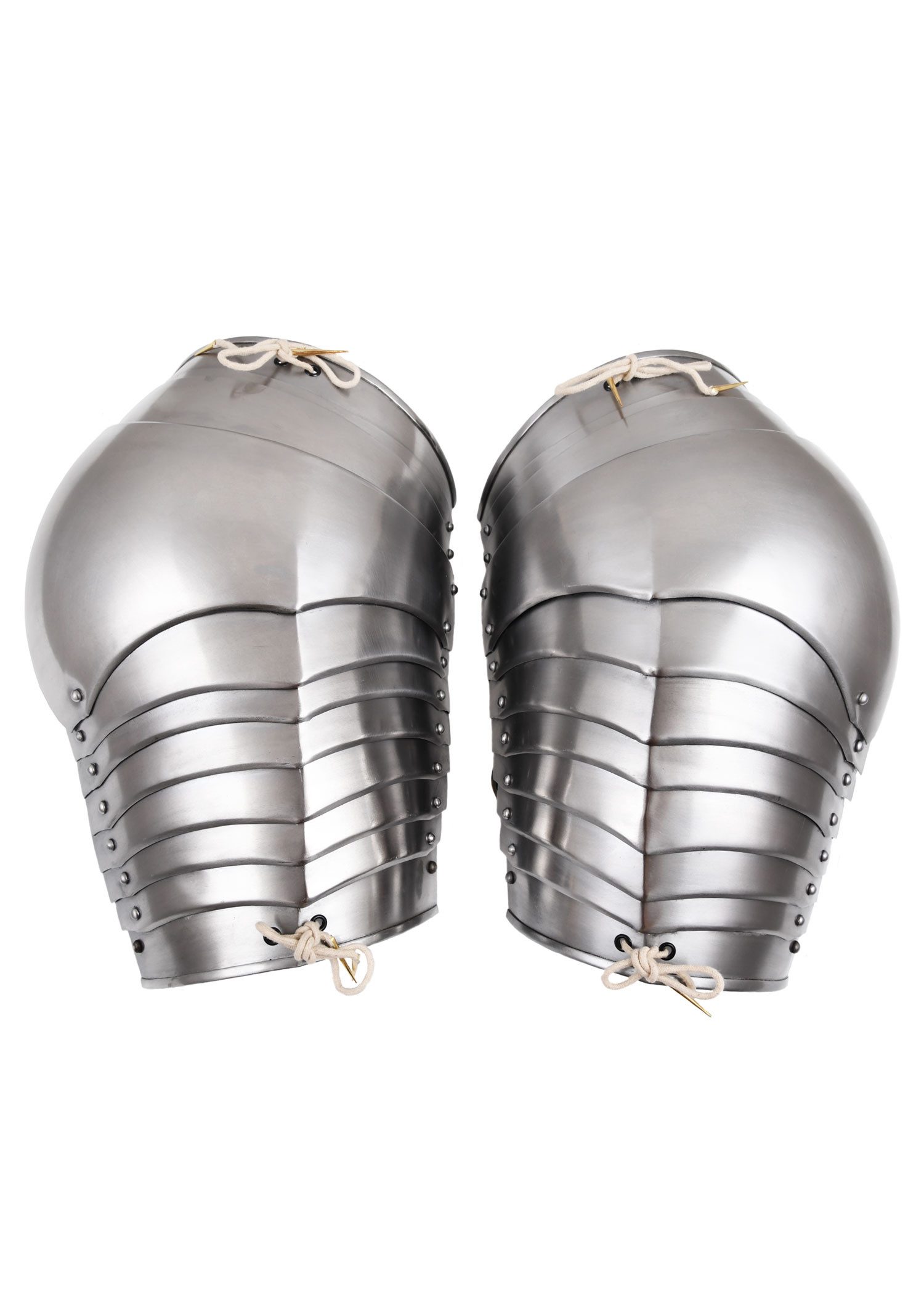 Diese mittelalterlichen Schulterplatten sind eine detailgetreue Nachbildung spätmittelalterlicher Rüstungsteile und vereinen historisches Design mit stabiler Verarbeitung. Sie bestehen aus 1,2 mm starkem Stahl, der auf der Innenseite geschwärzt wurde, um vor Korrosion zu schützen. Die typische mehrteilige Konstruktion gotischer Rüstungen des 15. und 16. Jahrhunderts findet sich hier in insgesamt 11 Segmenten wieder: einer großen Hauptplatte, drei oberen sowie sieben unteren Geschüben. Diese sind durch Stahlnieten beweglich miteinander verbunden und ermöglichen so eine flexible Passform und hohe Bewegungsfreiheit.