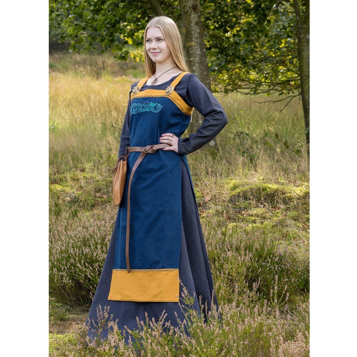 Das Schürzenkleid ist angelehnt an Funde aus Haithabu und Darstellungen aus Birka.