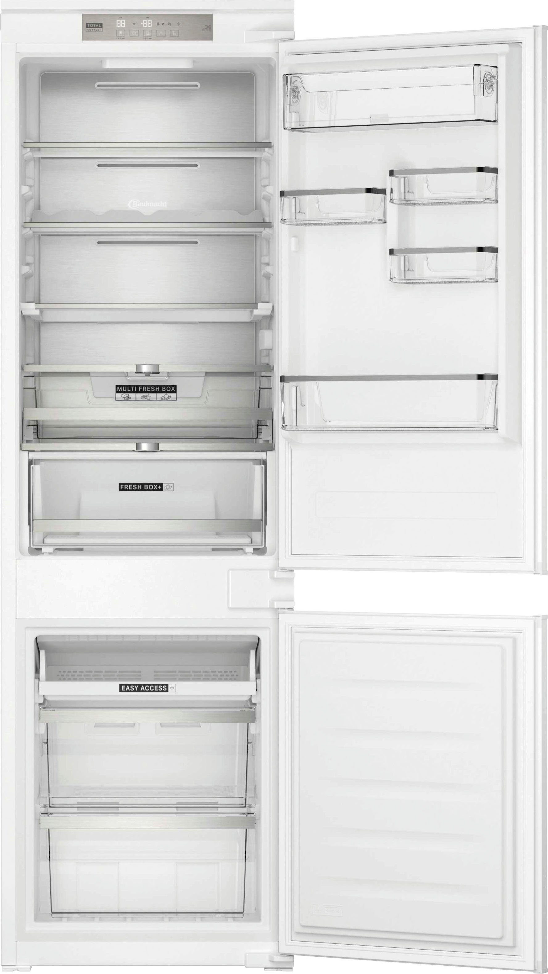 Die Einbaukühlgefrierkombination »KGITN 18MMF3« ist von der Marke BAUKNECHT und integrierbar. Bei einem Gefriervolumen von 68 l und Kühlvolumen von 182 l betragen die Maße des Modells 55,7 x 177 x 54,5 cm (B/H/T). Das Modell arbeitet mit einem Betriebsgeräusch von 34 dB. Zur optimalen Lagerung von Fleisch, Fisch, Obst und Gemüse erzeugt die FreshZone-Schublade einen konstanten Temperaturbereich von ca. 2-5 °C. Es sind ebenso drei Gefrierschubladen zum Verstauen des Einkaufs integriert. Auf dem außen installierten Display kann die genaue Temperatur im Gerät abgelesen werden. Auf vier Ablageflächen aus Glas, davon drei höhenverstellbar, ist in der Einbaukühlgefrierkombination genug Raum für Lebensmittel. Für das einfache und schnelle Befüllen ist das Modell mit einer ausziehbaren EasyAccess-Platte ausgestattet. Zusätzliche Flexibilität bei der Lagerung bieten die fünf Türablagen. Durch die Schnellgefrier-Funktion lassen sich Nahrungsmittel besonders schnell kühlen und einfrieren. Bei offen stehender Tür meldet dies die Einbaukühlgefrierkombination mit einem optischen und akustischen Warnsignal. Dank der LED-Innenbeleuchtung findet man sofort, wonach man sucht. Für diejenigen, die auf der Suche nach einer Einbaukühlgefrierkombination sind, ist die »KGITN 18MMF3« von BAUKNECHT eine gute Wahl.
