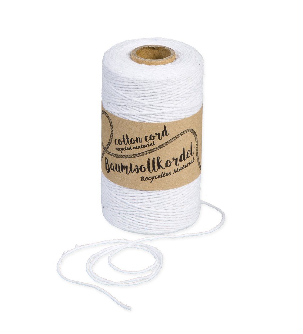 Baumwollgarn mit einer Длина von ca. 220 m und einer Stärke von ca. 1 mm. Das ca. 80 g schwere Garn eignet sich für viele filigrane Häkelarbeiten. Es handelt sich um recyceltes Material aus 90 % Baumwolle und 10 % sonstige Fasern. Super für zarte Handarbeiten wie Schmuckstücke, Untersetzer und Traumfänger. Auch für filigrane Makrameearbeiten wie kleine Wandbehänge nutzbar. Es kann produktionsbedingt zu Abweichungen in Farbe und Stärke kommen.