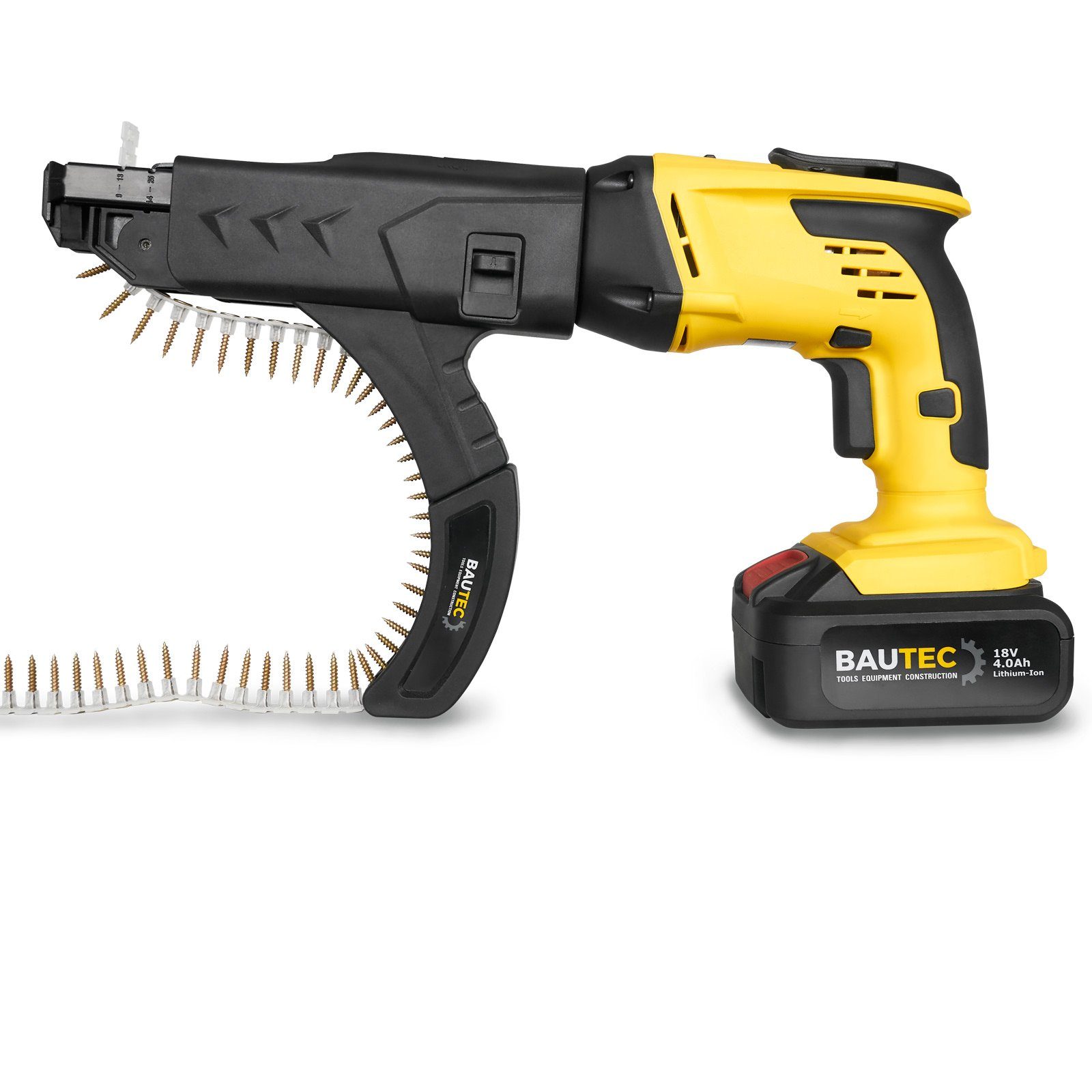 Der BAUTEC Trockenbauschrauber arbeitet sowohl mit gegurteten als auch mit losen Schrauben. Das Magazin für die handelsüblichen gegurteten bzw. magazinierten Trockenbauschrauben erlaubt extrem schnelles Arbeiten. Der kürzere Aufsatz / Bithalter mit magnetischer Bit-Aufnahme für die Arbeit mit losen Schrauben.