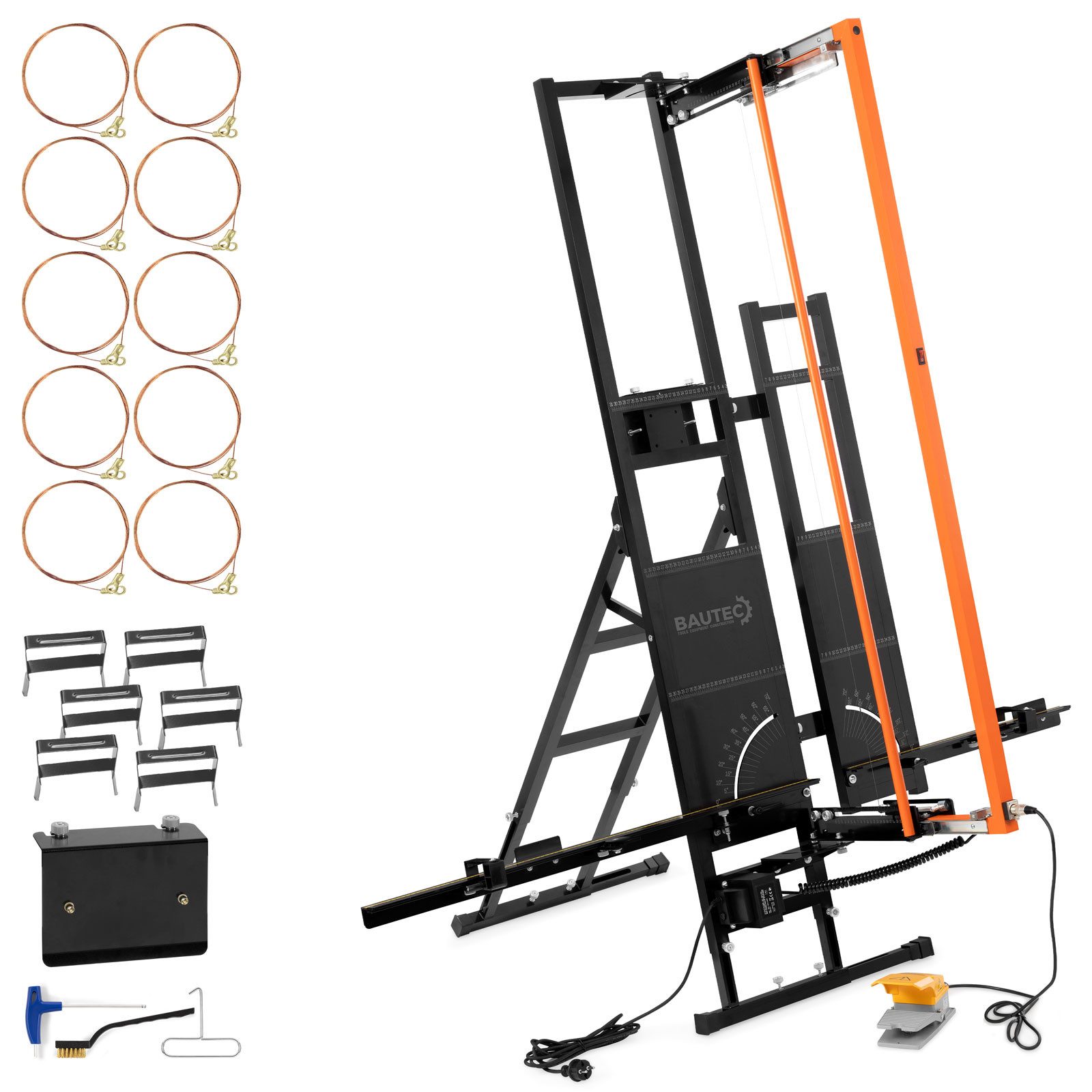 Lieferumfang | 1x Styroporschneider ALUCUTTER PROFI mit integriertem Standfuß; 1x Gerüsthalterung; 1x Fußschalter; 10x Schneidedraht; 6x Styrogrip; 1x Werkzeugset |