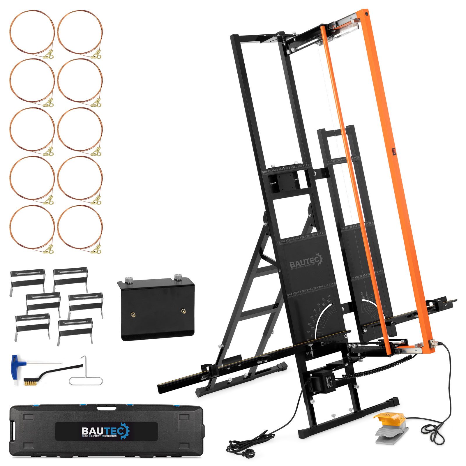 Lieferumfang | 1x Styroporschneider ALUCUTTER PROFI mit integriertem Standfuß; 1x Transportkoffer; 1x Gerüsthalterung; 1x Fußschalter; 10x Schneidedraht; 6x Styrogrip; 1x Werkzeugset |